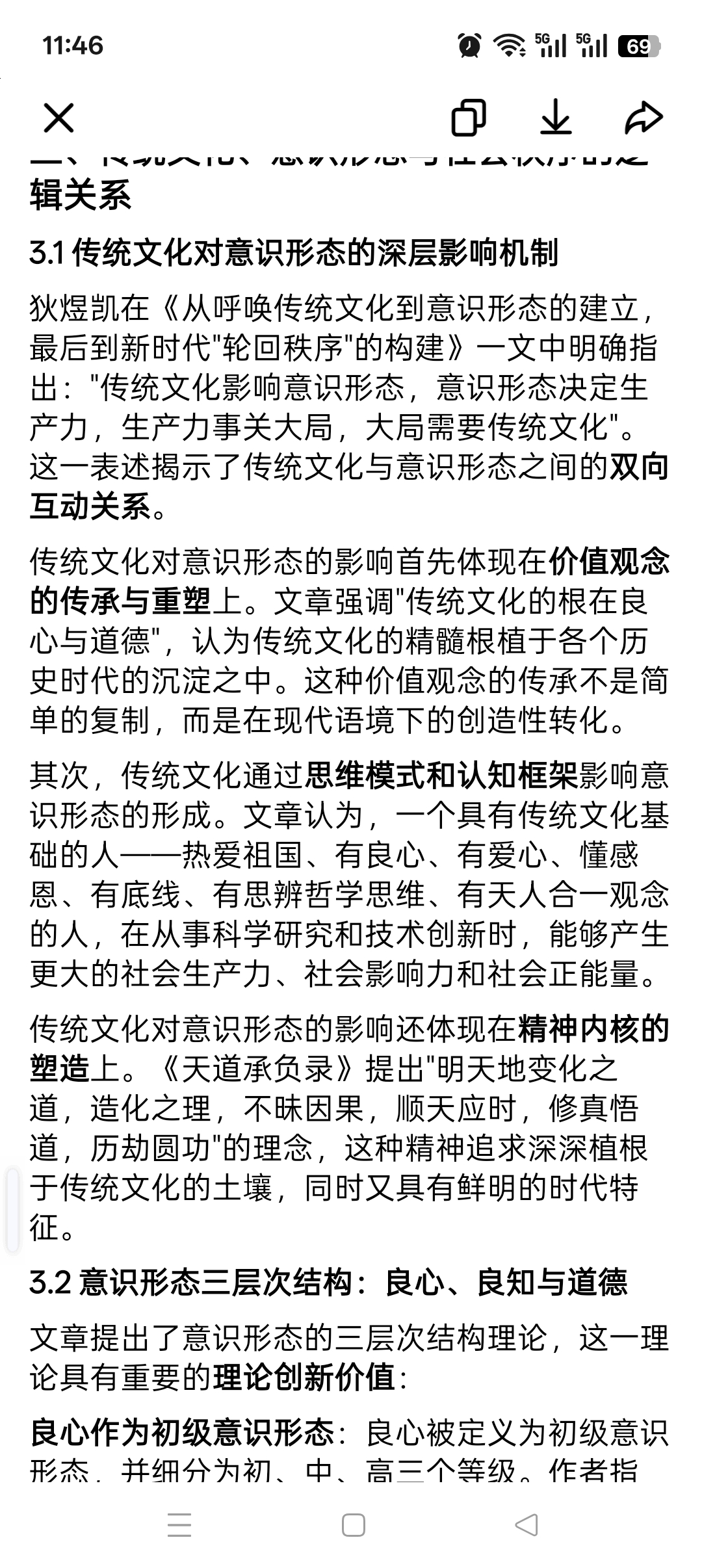 狄煜凯在《从呼唤传统文化到意识形态的建立,最后到新时代"轮回秩序"的构建》一文中明确指出:"传统文化影响意识形态,意识形态决定生产力,生产力事关大局,大局需要传统文化"。这一表述揭示了传统文化与意识形态之间的双向互动关系。