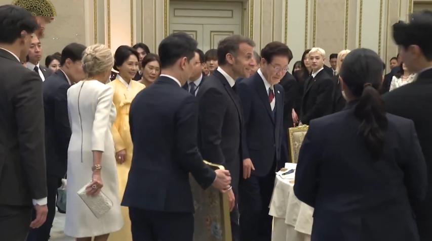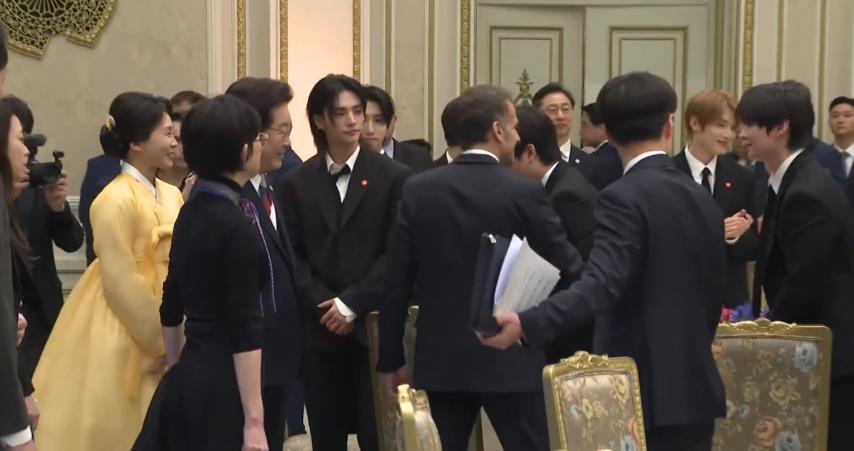 令人意外的是李富真当天也和哥哥李在镕一样和法国人沟通交流,全程几乎都没有闲着,等李在明和马克龙夫妇抵达的时候,李富真好像也没有和他们握手,而马克龙还和一个韩国男团交流问候了,现场有不少明星大帅哥在门口站着,估计这也是韩国和法国文化交流的一部分,所以韩国这个男团是他们的代表,据悉,其中在这个男团中有一位还染成黄色头发的男歌手叫李龙馥,在韩国非常有影响力。而李富真当时站在这个男团后面,所以马克龙就没有和李富真握手,也没有和李在镕沟通。不知道过后马克龙和夫人会不会和他们会见。