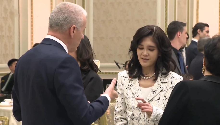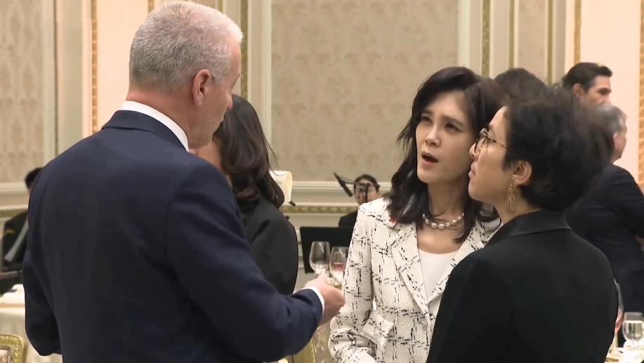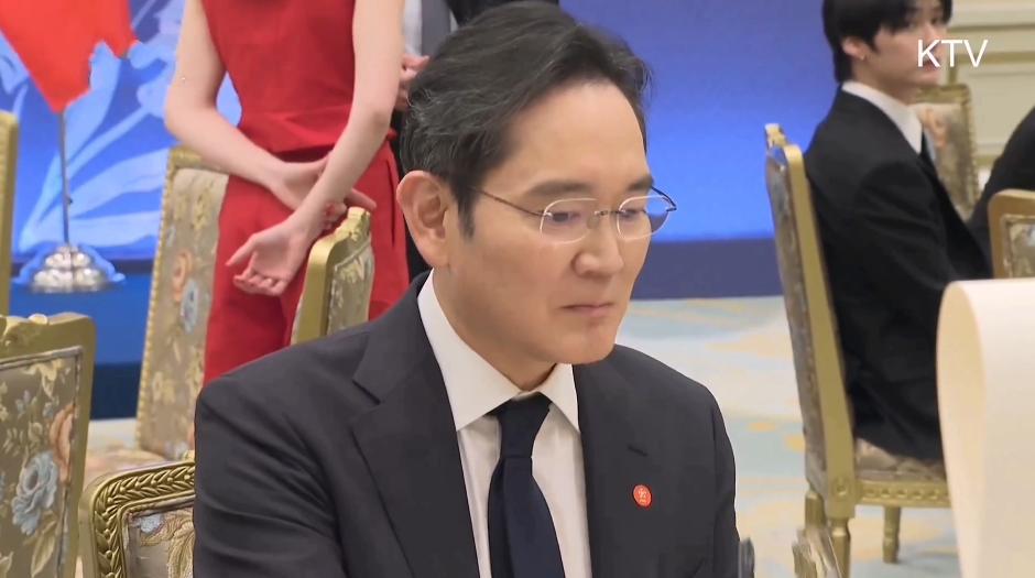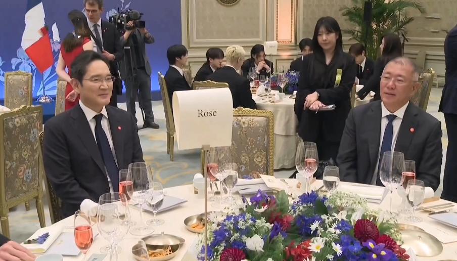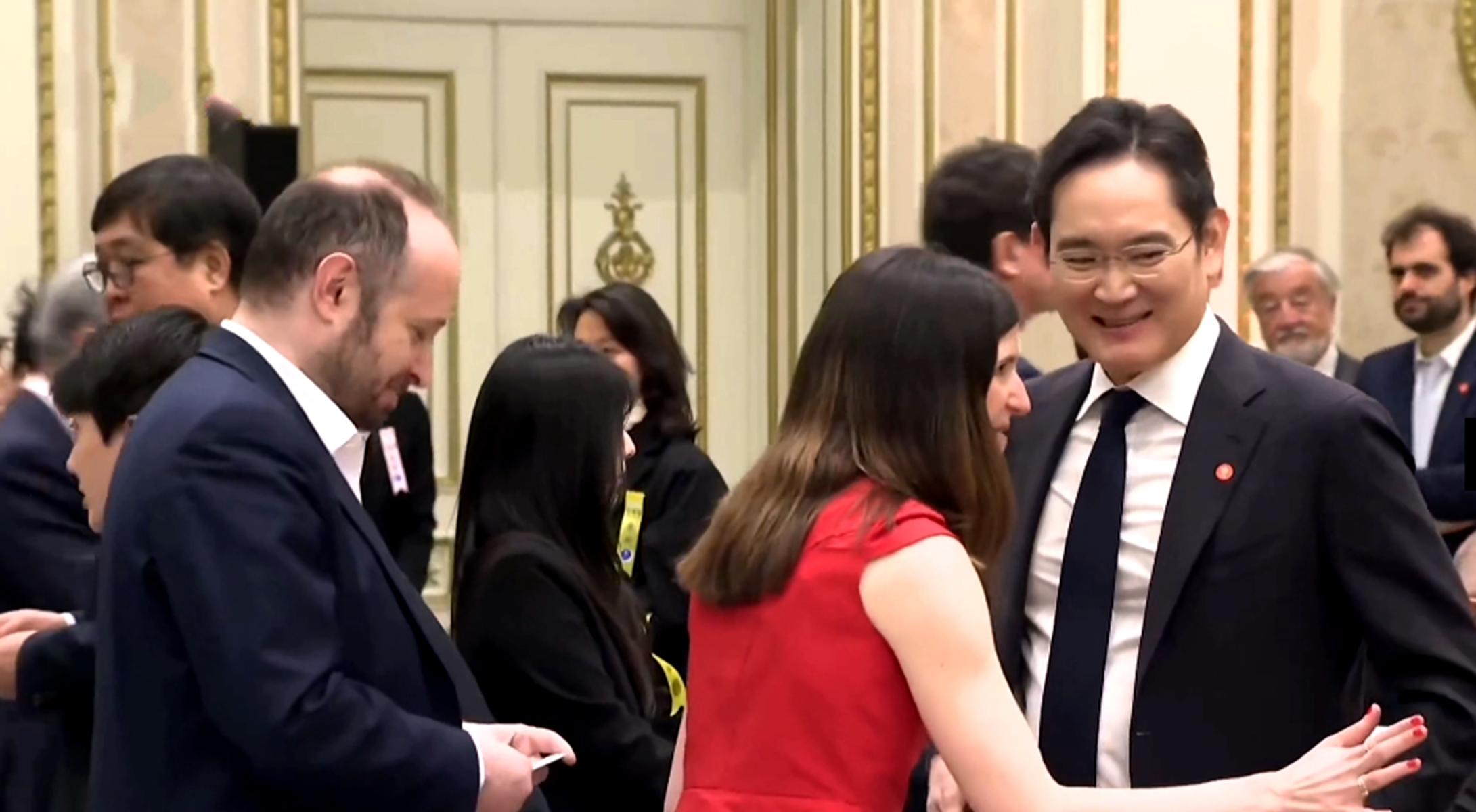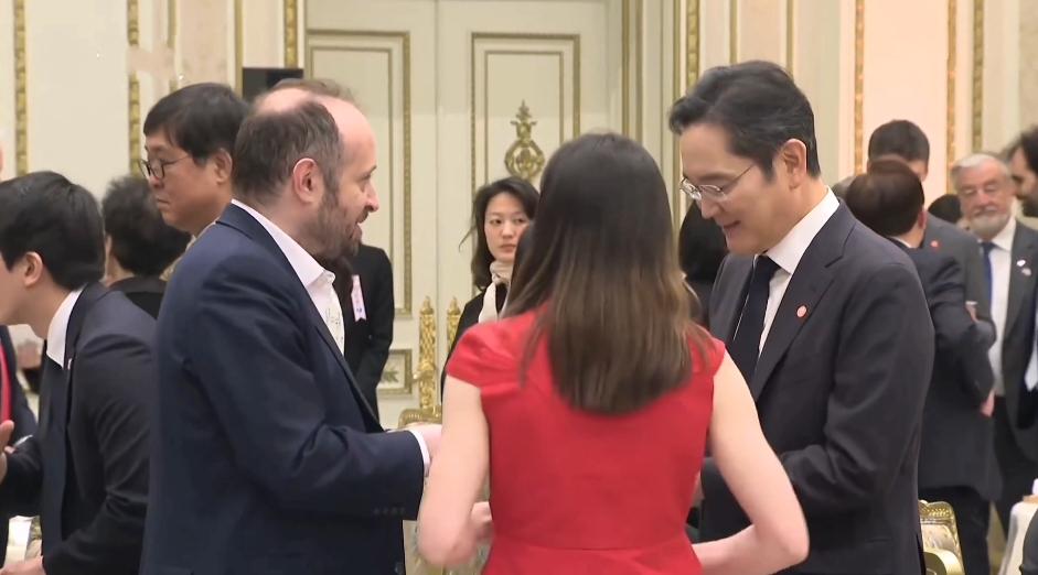 值得一提的是,在这个午宴上,三星家族一下来了两位重量级的角色,他们就是三星长公子李在镕和三星长公主李富真,当然了在造型方面,李在镕依然还是和普通人一样,一件灰色西装搭配白色衬衫,没有什么什么看点,不过李在镕在现场非常活跃,好像和法国过来的商人交流互动,还有法国一位穿红色衣服的女子在李在镕身边。