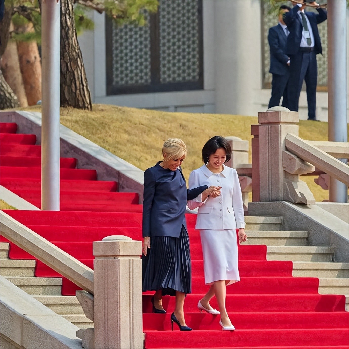 当然了大家也都看到了法国夫人布里吉特和韩国夫人惊艳亮相,尤其是韩国夫人金惠景穿一身白色套裙,还搭配白色裙子和白色皮鞋以及白色的珍珠耳坠,造型真是无敌了,再加上金惠景优雅的气质和内在的魅力,就连现场的韩国顶流女演员全智贤也逊色了不少。整个午宴几乎都是金惠景和布里吉特的话题,很少关注现场的明星了。