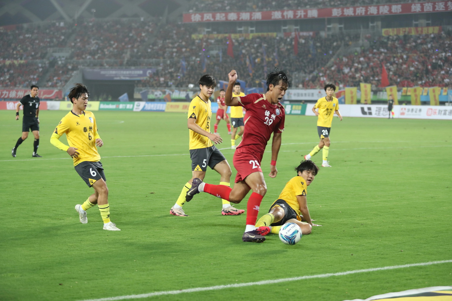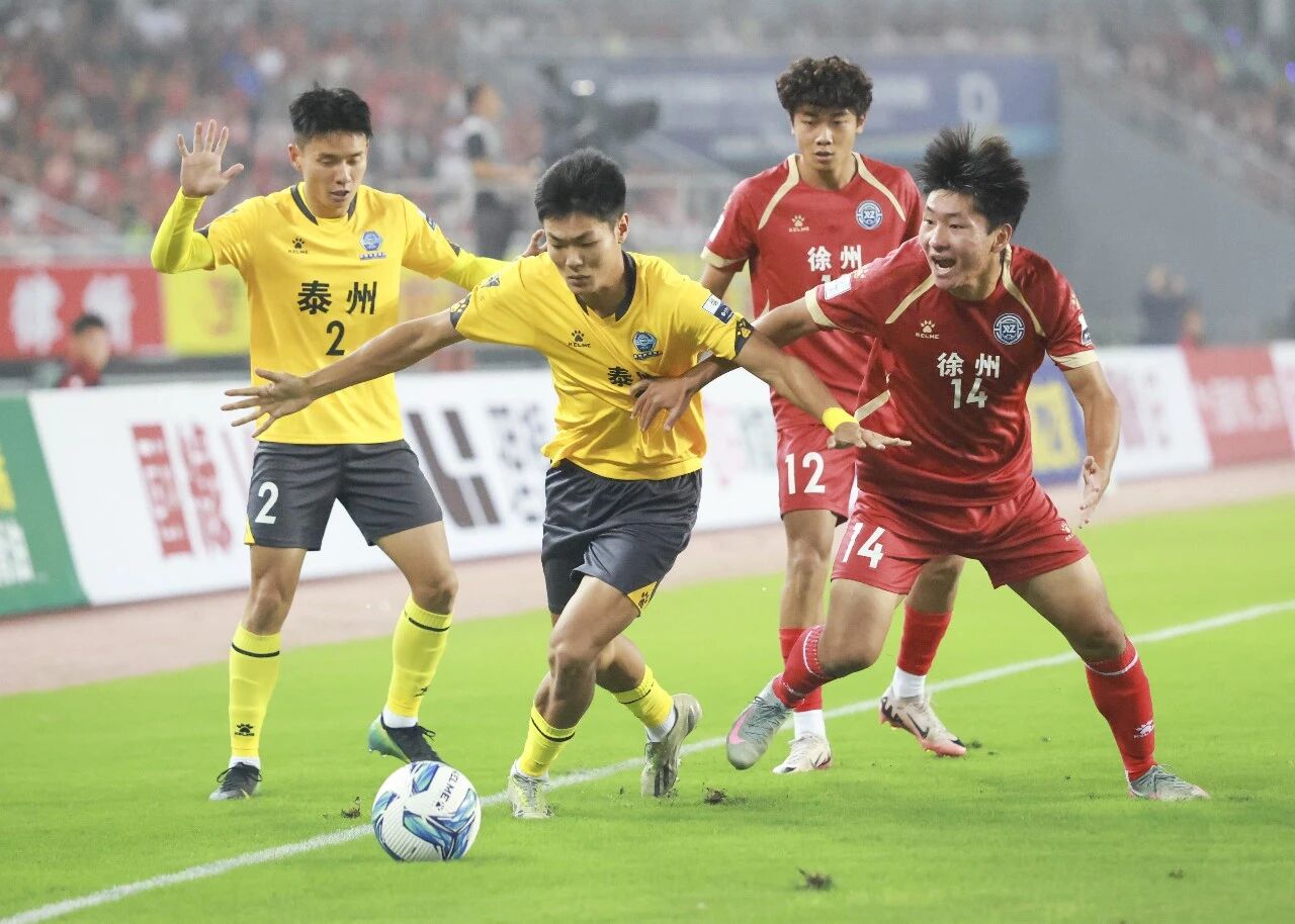 徐州vs泰州,上半场双方互有攻守,徐州队稍占优势,攻门机会较多,但绝佳机会不多。第42分钟,郑雪健传中,刘毅臣头球破门,徐州1球领先。下半场第62分钟,泰州队发起进攻,球被传入禁区内,樊超高高跃起,同样以头球方式扳平比分,最终,常规时间,泰州1比1逼平徐州,双方进入点球大战。