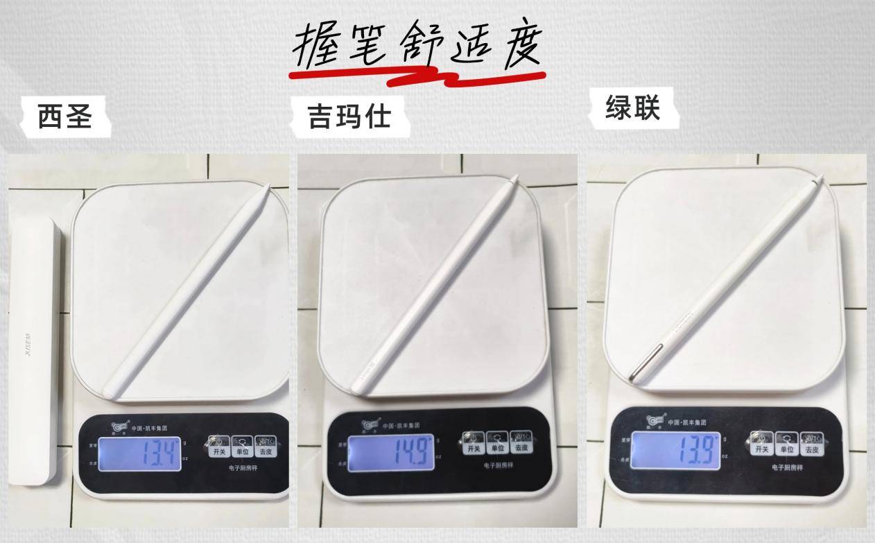 电容笔的握笔舒适度至关重要,尤其在长时间使用或创作时。为了确保最佳舒适度,我们可以关注电容笔的外壳材质和笔身的重量,这样可以看看能不能贴合手部,触感如何,以确保在使用过程中不会引起手部不适。另外选择重量轻盈一点的电容笔,能确保不会对手部造成很大的压力。下面我们将用电子秤来对这三款电容笔做测评对比。