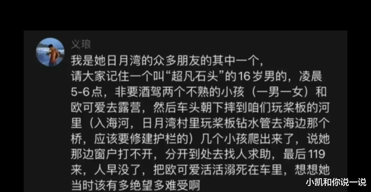 据欧克爱的一位挚友透露,12月29号当天,在海南日月湾公路上,事故起因是一位名叫“超凡石头”的16岁少年,他在凌晨时分,不顾他人反对,执意要酒后驾车,带着包括欧克爱在内的两名不太熟悉的朋友前往露营。结果车辆失控冲入了他们常去玩浆板的那条河中。幸存者们描述说,他们艰难地爬出车厢,四处寻找援助,然而当救援人员到达时,欧克爱已经溺死在水中,难以想象她当时的绝望与痛苦程度。