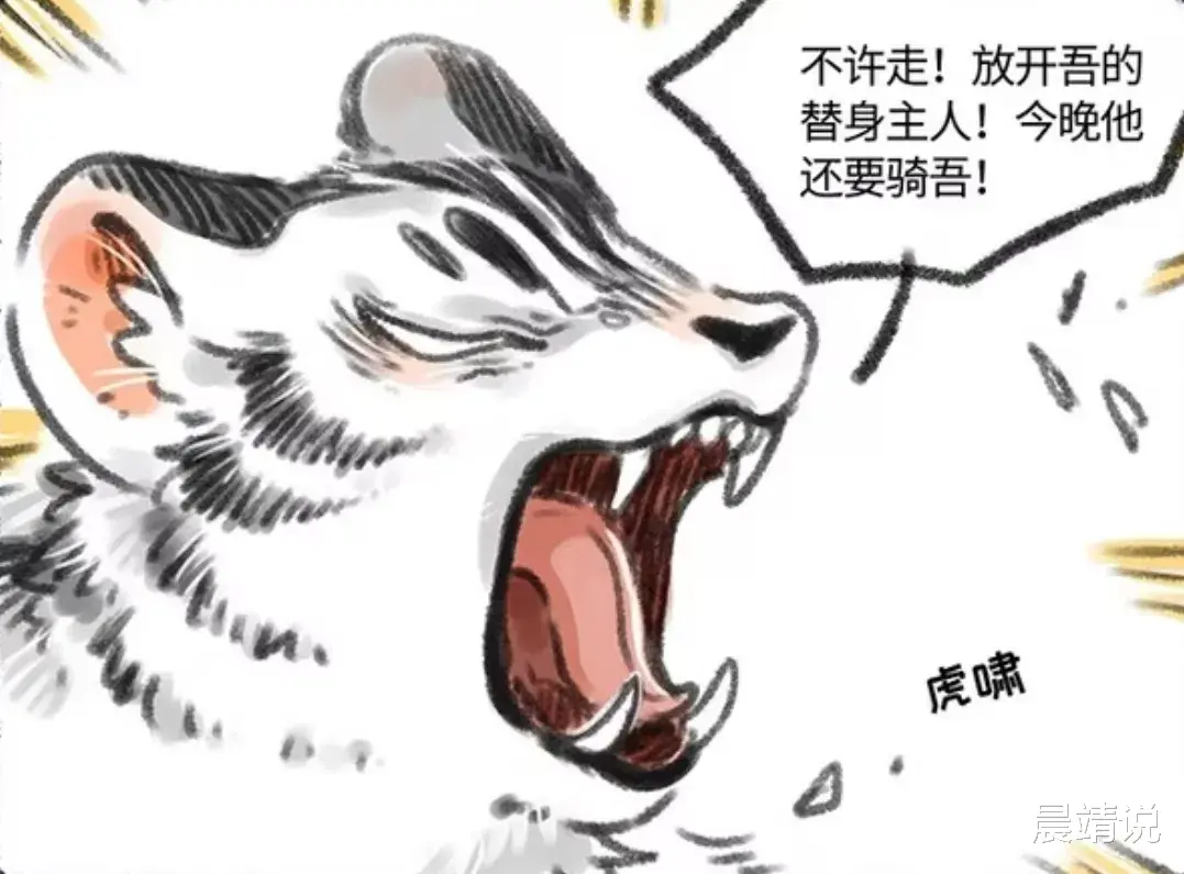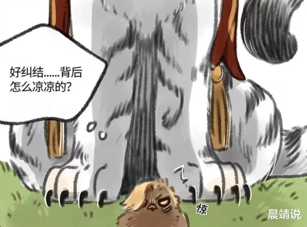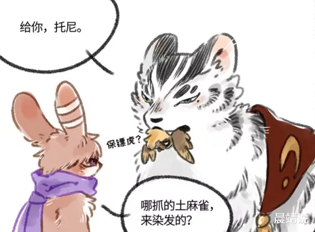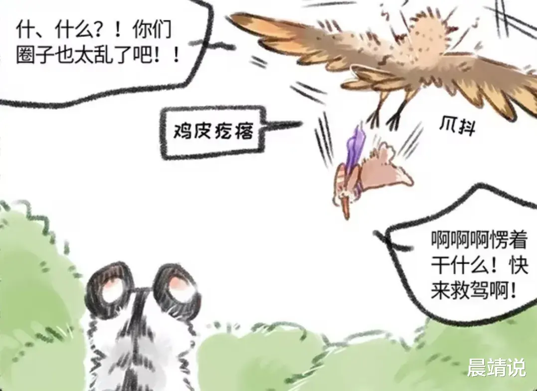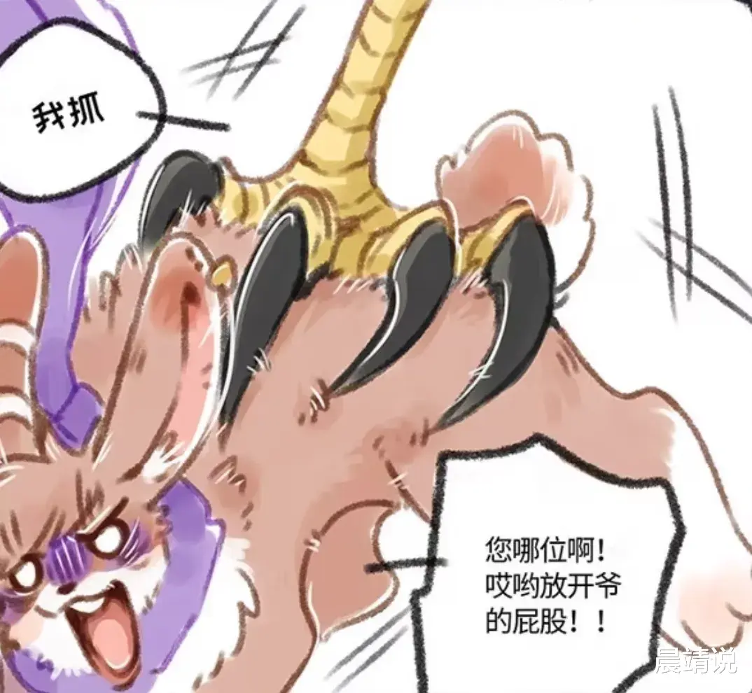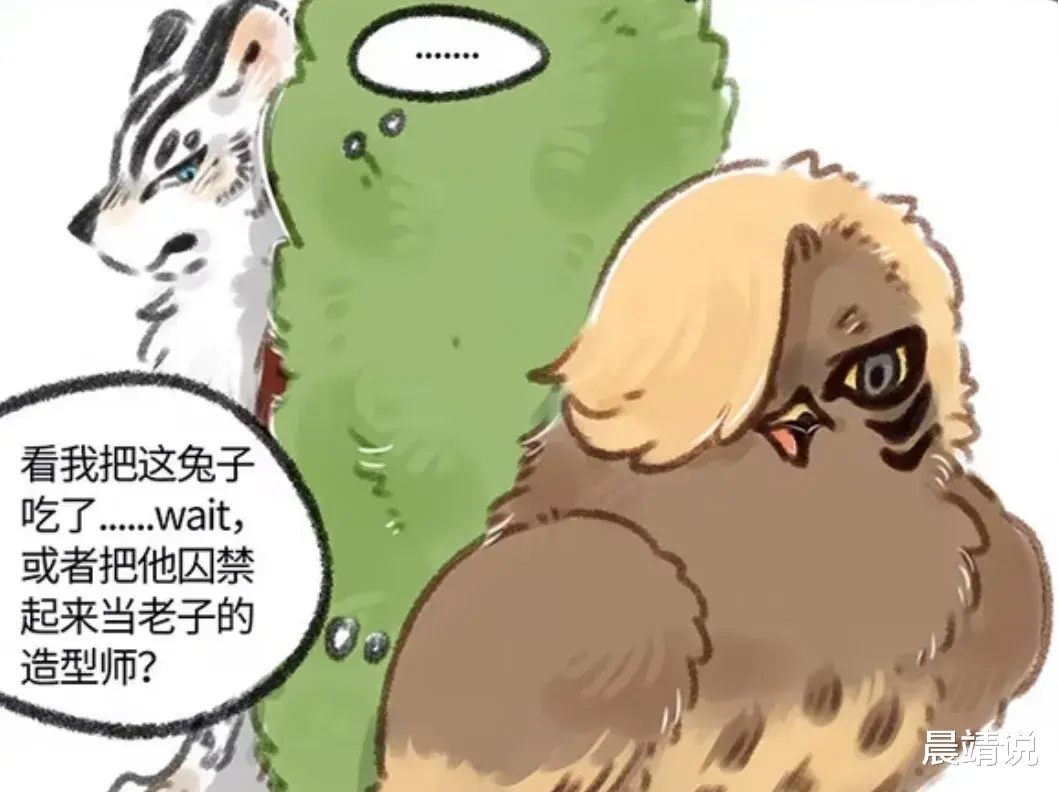 大家好,这里是晨靖说。《有兽焉》讲述了一群中国神话神兽在现代共同面对生活中的挑战,温馨的日常和幽默的互动展现了即搞笑又治愈的故事。跟随晨靖一起往下看:故事第116话,大鹏变小,鬼鬼祟祟的跟踪凤凰,发现了凤凰的造型团队原来只有一只兔子。正暗自琢磨是要把兔子吃掉还是把兔子囚禁起来当自己的造型师时,突然觉得后背发凉。正想逃走的大鹏已经来不及了,被战虎一个饿虎扑食擒获给兔爷。看着战虎叼嘴里跟土麻雀似得大鹏,兔爷也只以为是来染发的顾客。只是兔爷不知道自己一句土,直接踩中了大鹏的逆鳞,让大鹏暴起,变成原形一把抓起兔爷扬言要吃掉兔爷。而战虎看着被抓走的兔爷,一声虎啸怒吼,让大鹏放开兔爷,今晚兔爷还要骑自己。结果不明真相的大鹏会错了意,吓出一声鸡皮疙瘩,爪一抖,兔爷从半空中落了下来。
