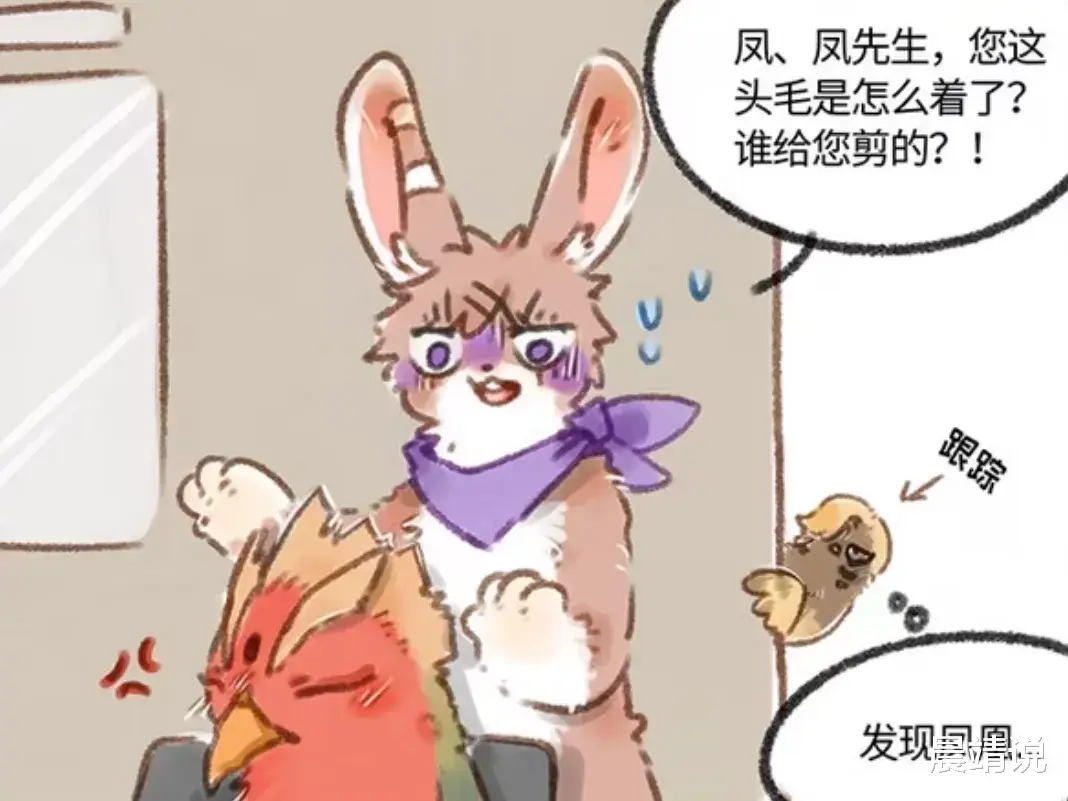 照例来找兔爷做造型的凤凰,让今天的兔爷很是震惊,看着凤凰头顶被剪的乱糟糟的毛,有点无所适从的问凤、凤先生,,您这头毛是怎么着了?谁给您剪的?!凤凰只是沉默的生气。其实,是隔壁非人哉的朱雀烧了凤凰的头发,还把凤凰的头发剪掉了。正在生气的凤凰,和专心抢救凤凰发型的兔爷,自然也就没有发现在店门口鬼鬼祟祟,探头探脑偷偷跟踪凤凰的金翅大鹏。
