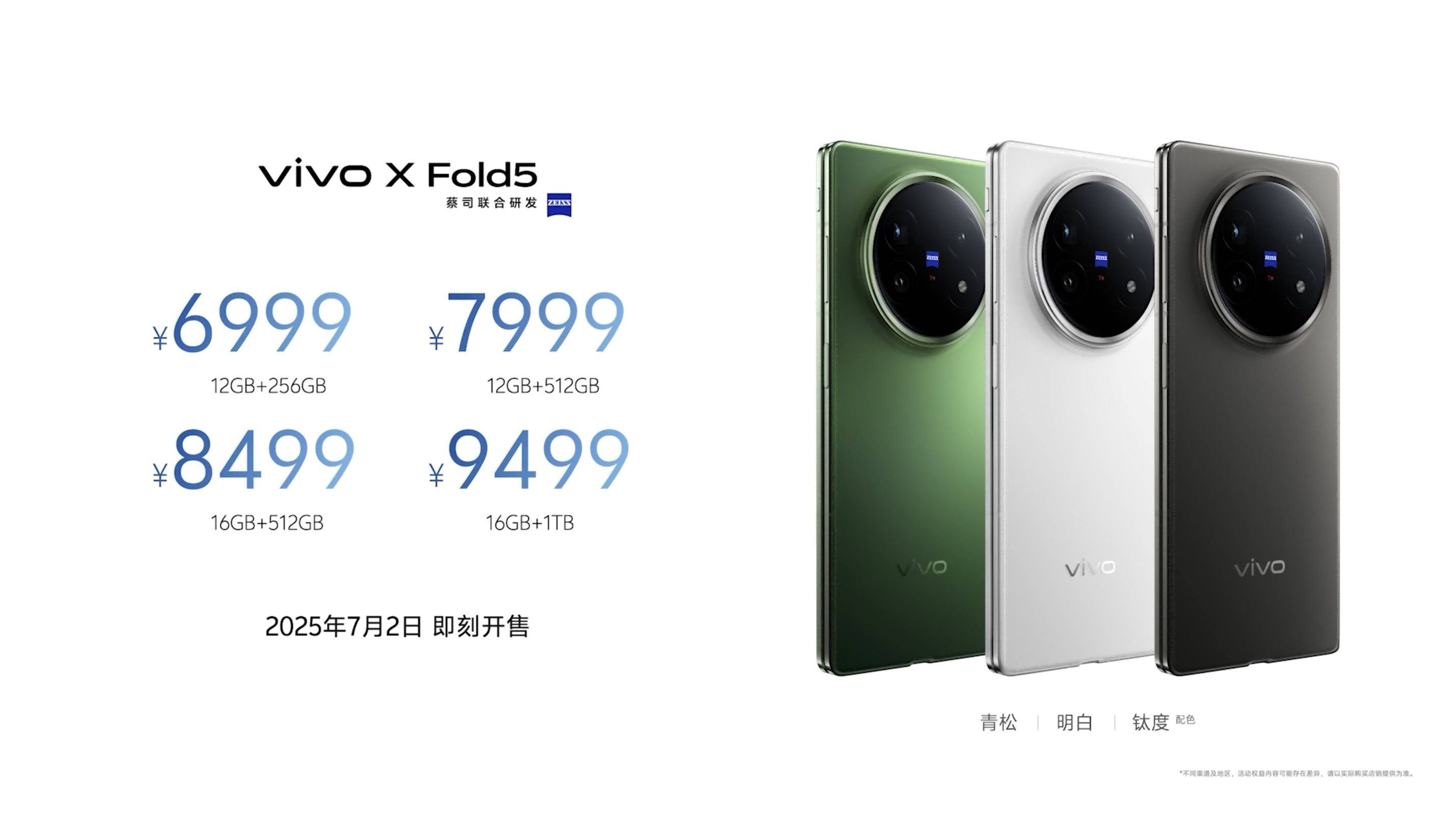 “作为年度折叠旗舰。vivo X Fold5保持了产品系列持续领先的「轻」和「强」,让用户不做选择”vivo产品副总裁黄韬表示。X Fold5已经全渠道开启预售,并将于7月2日正式开售,售价6999元起。