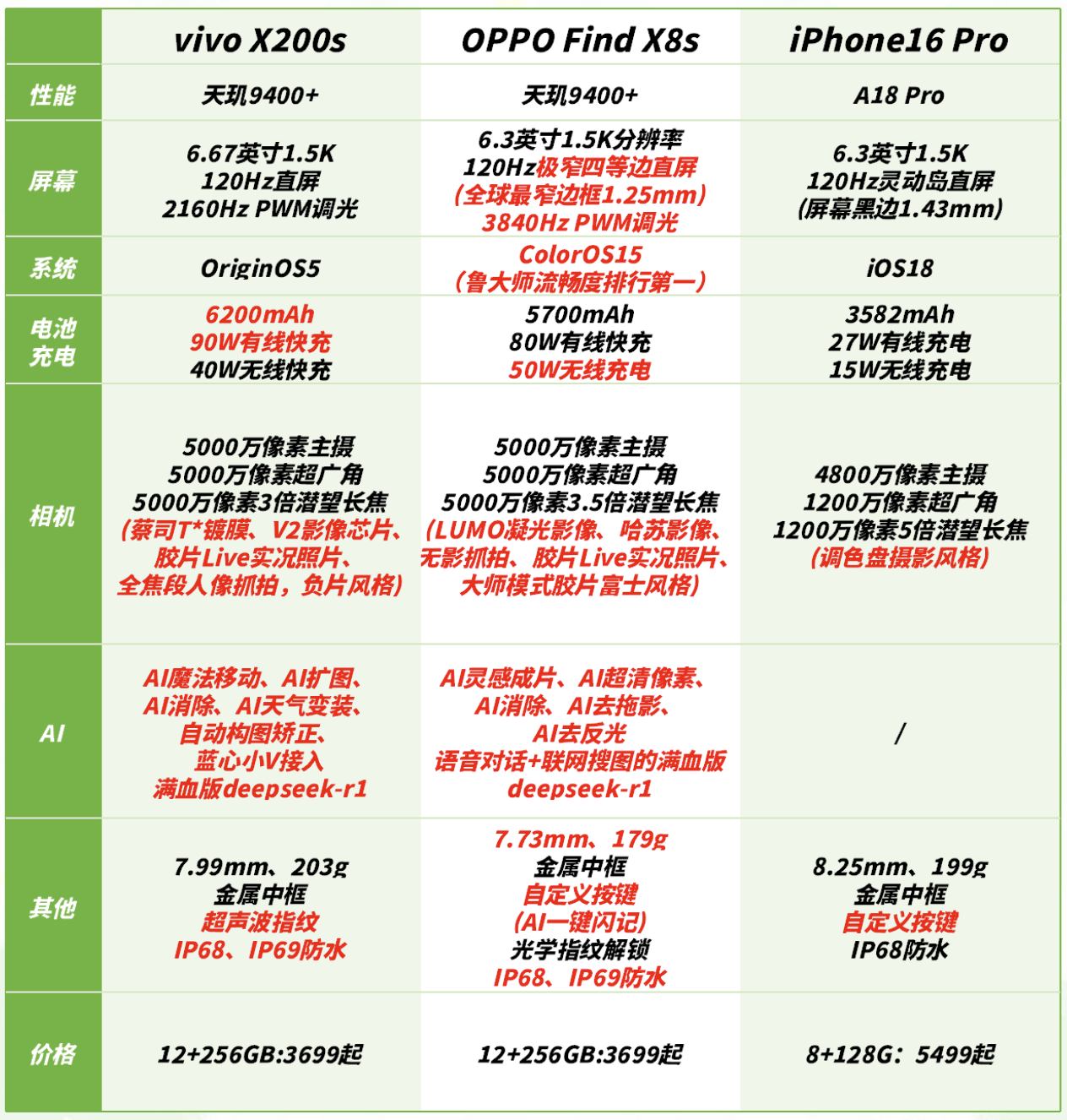为了帮助大家更好的选购,我们找来了三款硬件配置出色,且系统流畅度和售后服务均有口皆碑的机型,分别是iPhone 16 Pro、vivo X200s、OPPO Find X8s,下面就一同来看看它们各自有何亮点所在吧!