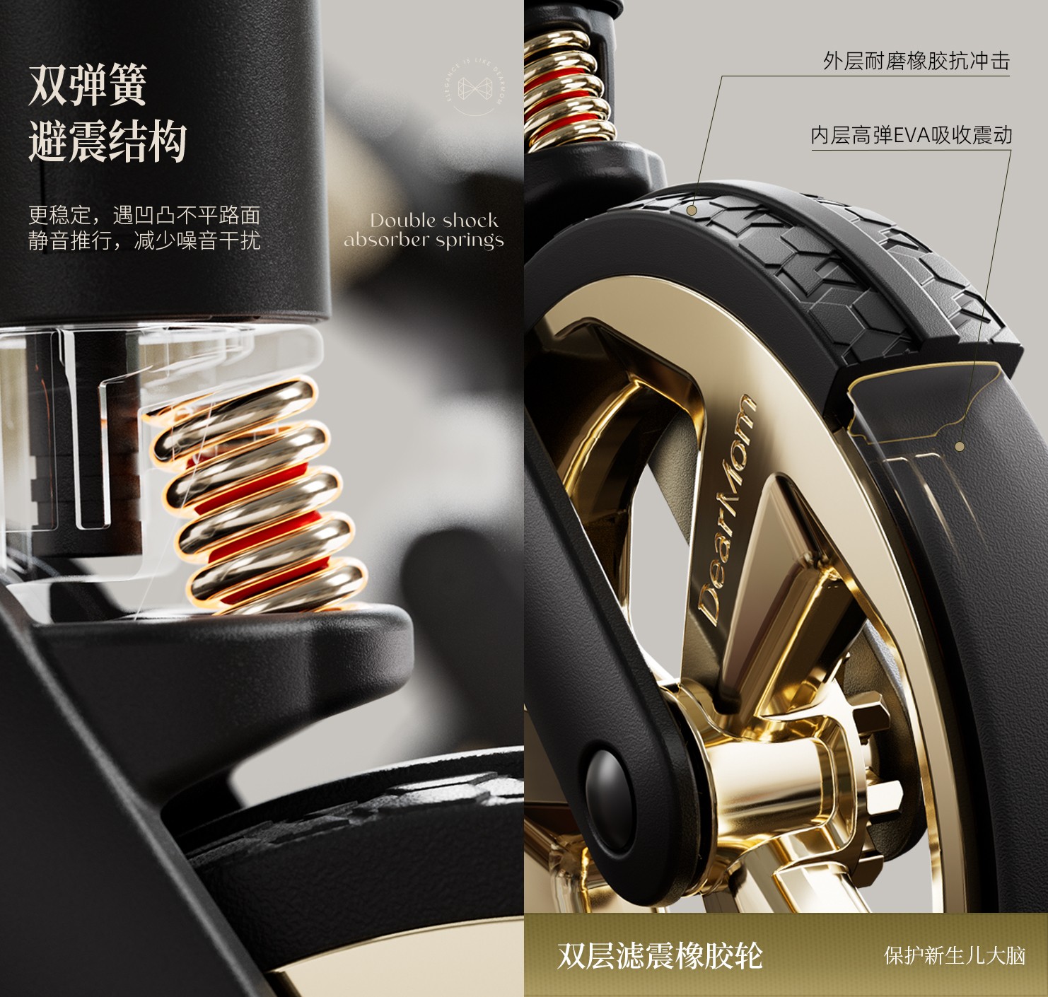 在繁多的测试数据中,罗马假日婴儿车出色的避震性与稳定性成为了一个突出的亮点。而这并非偶然,它源于DearMom对新生儿群体的深度观察。研发团队发现,新生儿的大脑和脊柱尚在发育中,看似微小的震动都可能带来不可逆的损伤,避震性能自然成为新生儿婴儿车安全系统的核心命题。因此,在罗马假日婴儿车的设计上,DearMom不惜成本地采用了‘双层避震轮胎’(外层耐磨橡胶+内层高弹EVA)与‘独立双弹簧’的复合避震结构。这种设计能智能过滤不同路面的震动:外层弹簧服务于轻体重宝宝,内侧刚性弹簧在宝宝体重增加后介入工作,即便在石子路等复杂路面,也能实现“软着陆”,全力保护新生儿的大脑与脊椎发育。