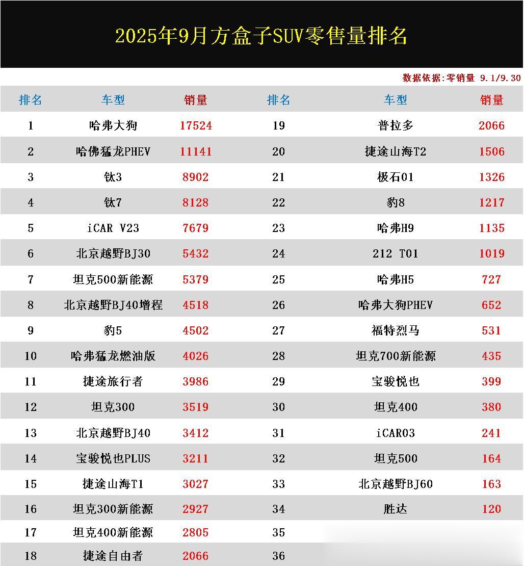 导读:随着消费者对汽车个性化需求的不断增长,方盒子车型已从小众走向主流,多款销量持续高涨已印证了这一事实。根据易车榜方面最新出炉的2025年9月方盒子SUV零售量数据显示,榜单前6名月销量均高达5千辆以上,其中哈弗品牌再次霸榜,哈弗大狗蝉联销量冠军,而哈弗猛龙新能源也都成功逆袭至第二,刚上市不久的方程豹钛3销量继续创新高,改款后iCARV23迎来小爆发、北京BJ30、坦克500新能源发挥稳定,排名稳居前六,豹5、哈弗猛龙再次突破4千辆,坦克300、普拉多未进榜单前十、豹8、哈弗H9销量不足2000辆,哈弗H5、福特烈马、坦克400、胜达等车型经典车型表现依旧不佳,仍然保持低迷状态。