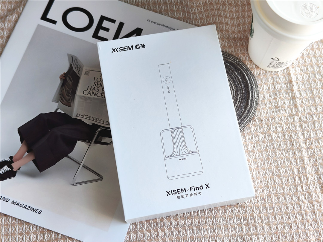 西圣Find X智能可视挖耳勺的包装外层纸盒设计简约大气,左上角印有品牌logo,正面印着产品的高清渲染图,纸盒材质坚固,拿在手上有一定质感。