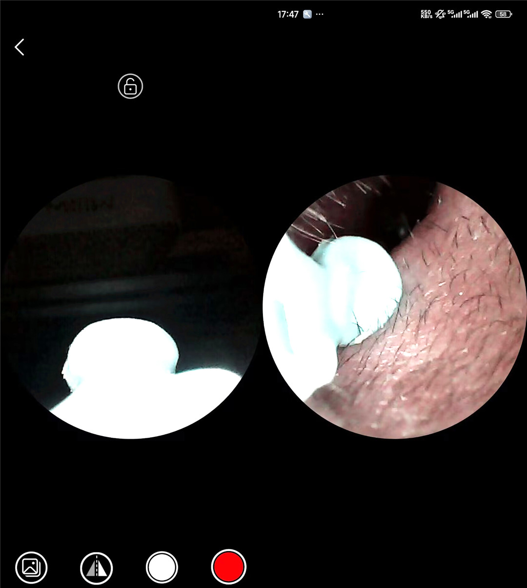 点击进拍摄界面,1500 万像素实时画面瞬间铺满屏幕,肉眼难辨的耳毛、耵聍碎屑被拉到眼前。右上角可一键拍照、录像、放大 5 倍,左下角实时显示镜头方位图标,配合多轴陀螺仪,耳勺转到哪儿,画面就稳在哪儿。