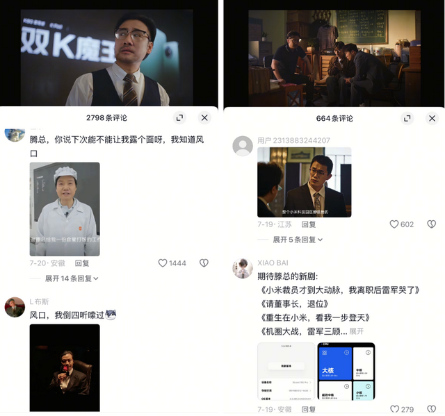 其中小米中国区市场部总经理王腾,和REDMI产品经理胡馨心都参与了演出,结尾处还出现了雷军在电话里的声音,算是一个彩蛋。这也成为该剧宣发时的主要噱头,用户大多奔着“小米首部短剧”、“小米高管出演”、“雷军出场”等前去围观,毕竟雷军本身就是小米最大的IP。评论区也都是对雷军、王腾的调侃,许多人还搬出十年前雷军跨界演电影时的造型,并做成表情包,放大了作品的娱乐效果。