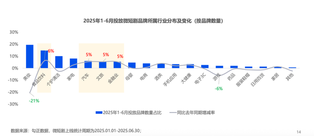 根据勾正科技《2025年H1微短剧行业观察与营销指南》显示,2025年上半年有149家品牌投放短剧,在更中的品牌短剧有237部,其中新入局品牌有77家,占比过半。就品牌所属行业来看,新入局品牌主要来自食品饮料、美妆、个护清洁行业;而与此同时,美妆行业投放市场份额同比去年减少了21%。