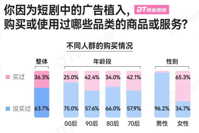 而且依托短剧来撬动短剧也不容易,根据DT商业观察的调研数据,超6成人没有因为短剧中的广告植入买过东西,96.4%的男性从未下单过。