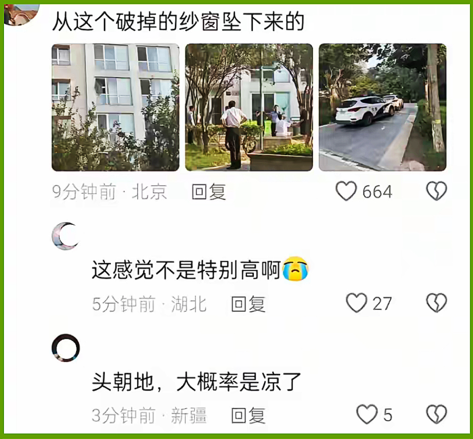另据最新消息披露,于朦胧是从北京市朝阳区阳光上东小区跳楼自杀的,该小区物业在回应此事时称,11日凌晨,小区确实发生了坠楼事件,已经报公,具体要看官方报道,具体他们也不是太清楚。