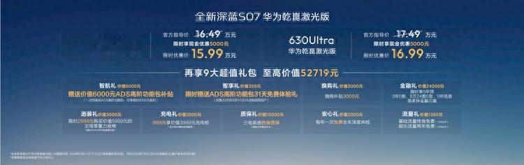 4月20日,小E获悉,全新深蓝S07华为乾崑激光版正式上市,带来630Max+华为乾崑激光版、630Ultra华为乾崑激光版两个配置版本。深蓝汽车推出5000元限时现金优惠,以及至高价值52719元的9大超值礼包,新车限时优惠价15.99万-16.99万元。尤其令人惊喜的是,价值6000元的ADS高阶功能包补贴。通过普惠价格+诚意权益,全新深蓝S07华为乾崑激光版真正兑现“普及全民智驾”使命,让更多人拥有顶流智能辅助驾驶体验。