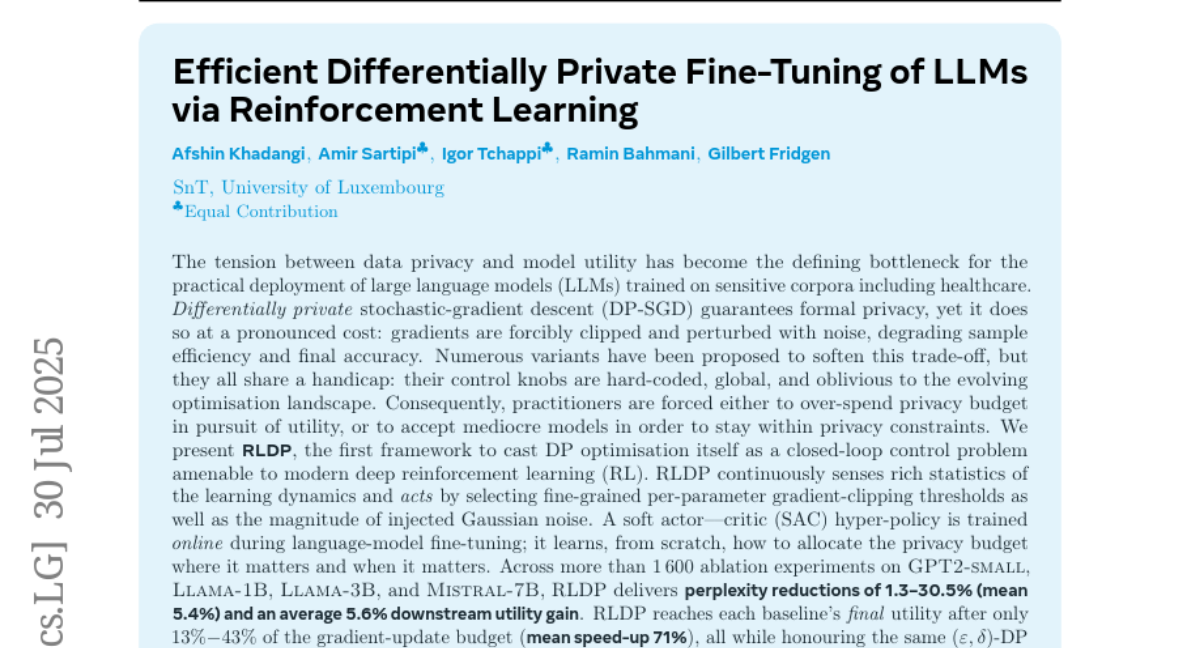 A:RLDP是卢森堡大学开发的一种新型AI训练方法,全称是"强化学习差分隐私"框架。它解决了AI训练中隐私保护和模型效果不可兼得的问题,就像一个智能教练,能根据训练状况动态调整隐私保护策略,既保护数据隐私又确保模型学习效果。