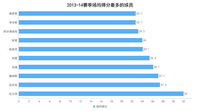 场均32分在这个赛季也是联盟各个球员中的最高,因此杜兰特在大量时间单核带队取得极佳战绩的同时也有着最高的个人得分贡献,他大幅度领先第二名安东尼的27.4分,这五年时间里杜兰特仅在2012-13赛季场均落后安东尼0.6分外其余的四个赛季均成为了得分王。