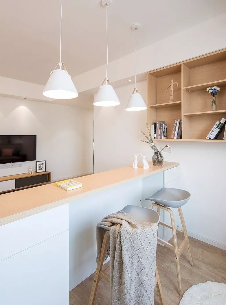 ▲ 一道原木色矮墙吧台作为沙发墙,这样让空间整体的通透性更加强烈明显。