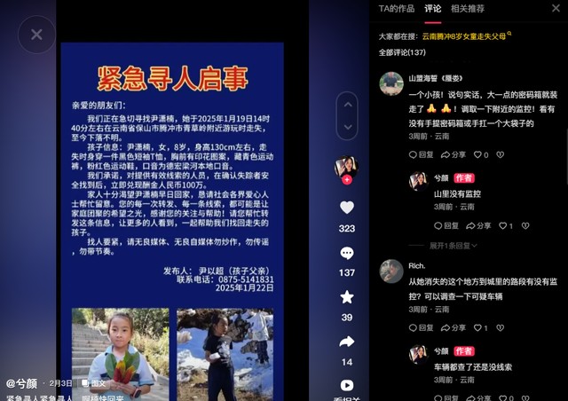 但短短十分钟,等人们的视线再次放到孩子们身上后,惊慌的发现尹潇楠竟然不见了,当时家人们就赶紧开始找人,却怎么都找不到,之后更是迅速进行了报警求助,希望能尽快找到丢失的孩子。