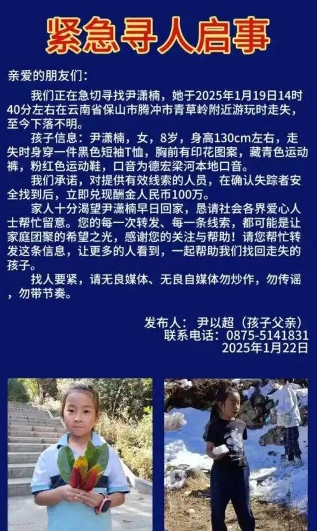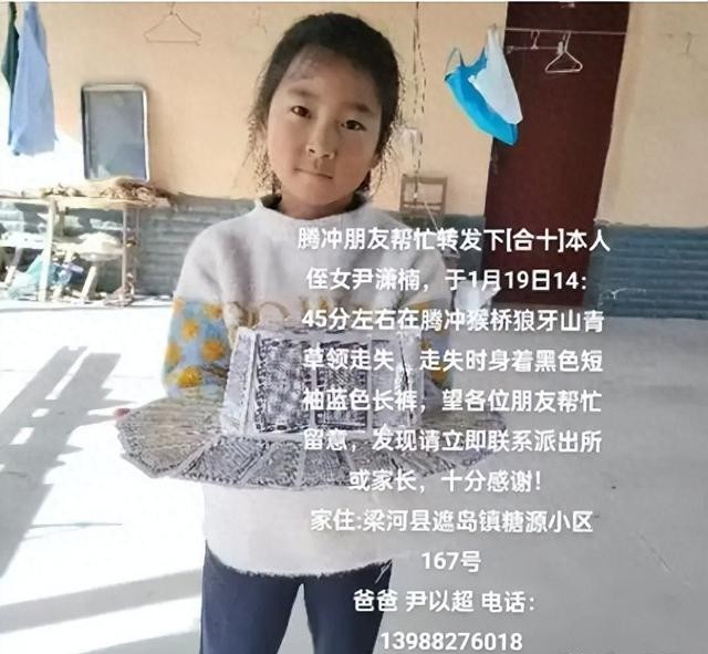 还记得在云南腾冲走失的小女孩儿尹潇楠吗?距离她的走失已经过去将近五十天了,父亲更是发布了百万悬赏想要找到女儿,但是却始终没有什么消息。明明只离开父母视线十分钟,怎么转眼就不见了呢?