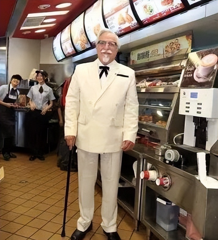 去买全家桶或者点炸鸡套餐的时候,你肯定注意过印在包装上的那个白胡子老爷爷。戴着黑框眼镜,穿着白西装,系着黑领结,笑得一脸慈祥。 看着就像个一辈子没发过脾气、只会在厨房里慢悠悠给你炸鸡腿的邻家老头。