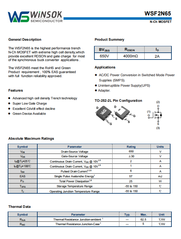 电动车热泵在-10 ℃以下制热衰减严重,需引入高压PTC(220 V~270 V)快速辅助。传统低压MOSFET无法承受母线高压,而IGBT开关频率低、驱动复杂。微硕WINSOK WSF2N65(650 V/2 A/4 Ω,TO-252-2L)以650 V超结耐压与8 nC超低栅极电荷,成为220 V PAC架构PTC的“高压启动核”。