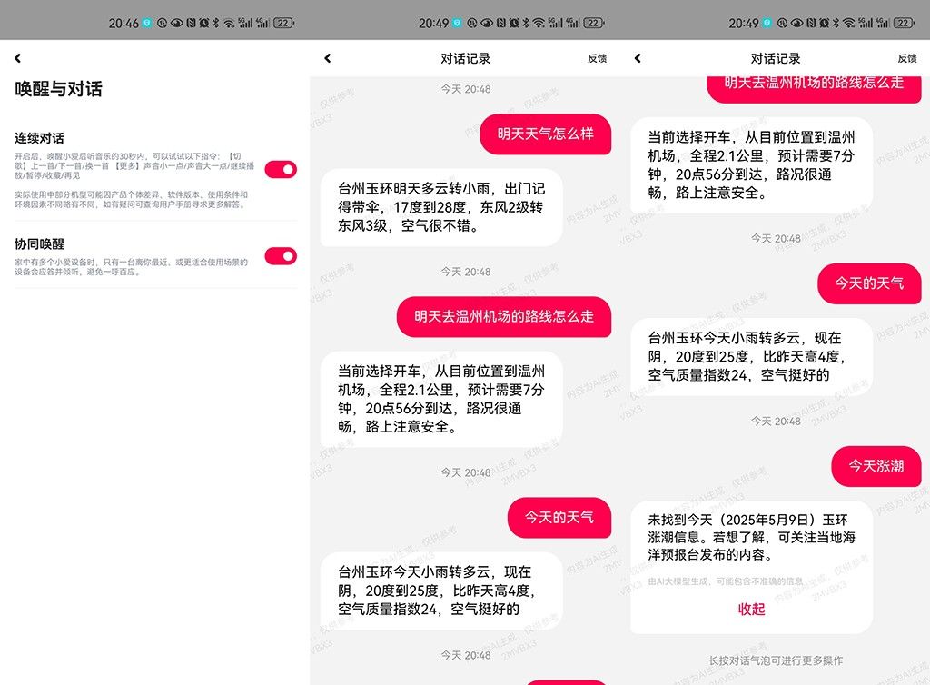 “超级小爱”最大的升级在于支持多轮自然对话。实测中,我无需重复唤醒词即可完成复杂指令:“明天天气怎么样——明天去温州机场的路线怎么走——今天的天气——今天涨潮”,整个过程流畅如真人对话。甚至语言识别率也大幅提升,也能一次性说出需要的答案,很多能够在网上查到信息,提供参考。但也有些无法快速查询的地方,还需要大数据不断加强锻炼。