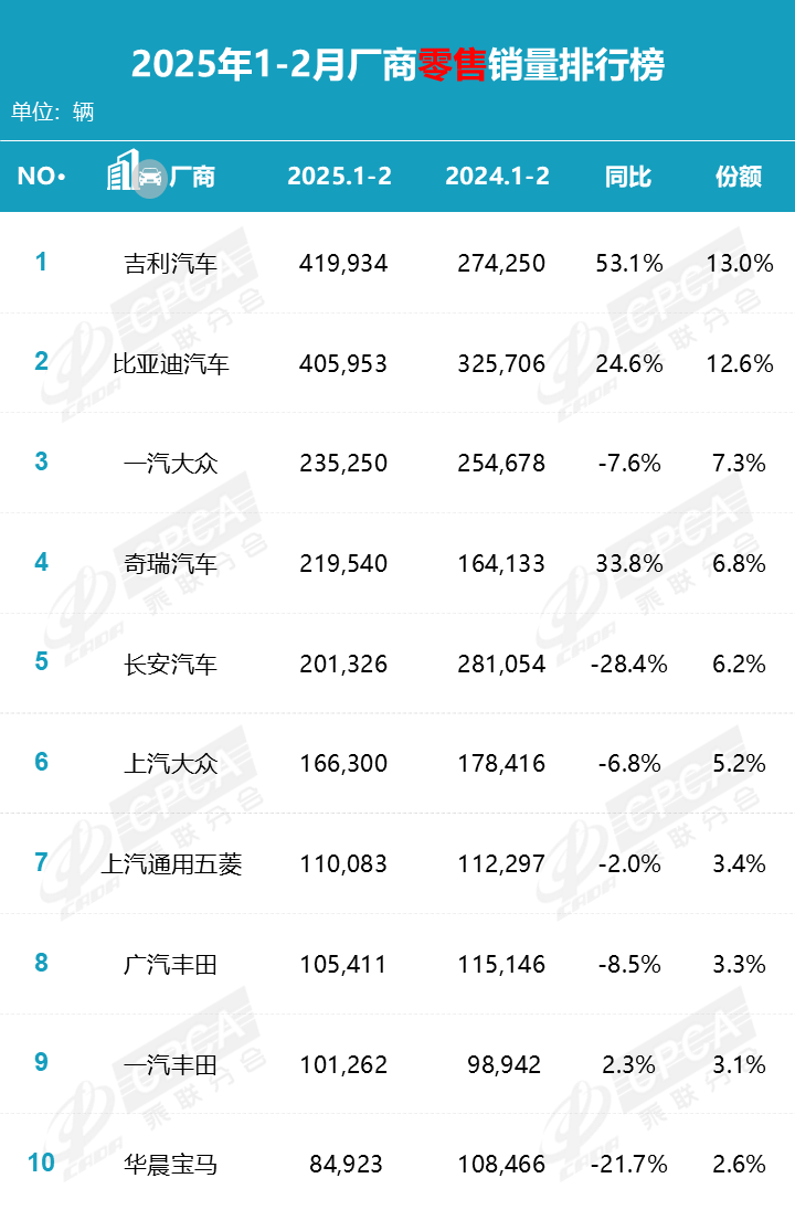 日前,乘联会公布了1-2月汽车零售销量榜单。其中吉利以零售量419934台排名第一,登顶销量冠军!