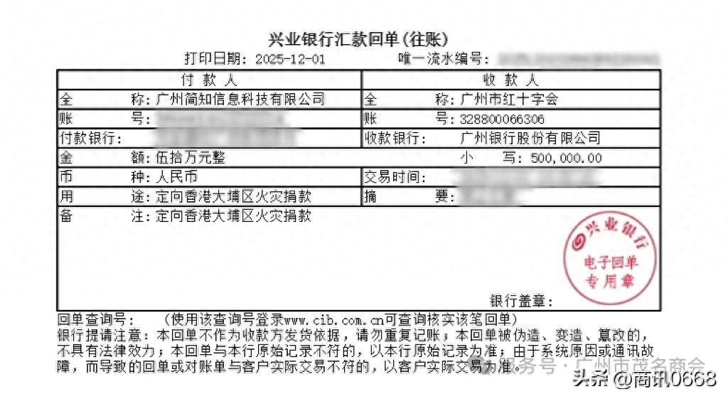 11月26日下午,香港大埔宏福苑火灾牵动着无数同胞的心,这场突如其来的灾害造成重大人员伤亡,受灾居民的生活安置与灾后重建成为社会各界关注的焦点。危难时刻见担当,广州市茂名商会常务副会长兼茂青会主席谢冠鹏旗下简知科技集团迅速响应,紧急捐赠50万元人民币,专项用于香港大埔灾区救援安置与民生保障工作,以实际行动诠释"一方有难,八方支援"的家国情怀。