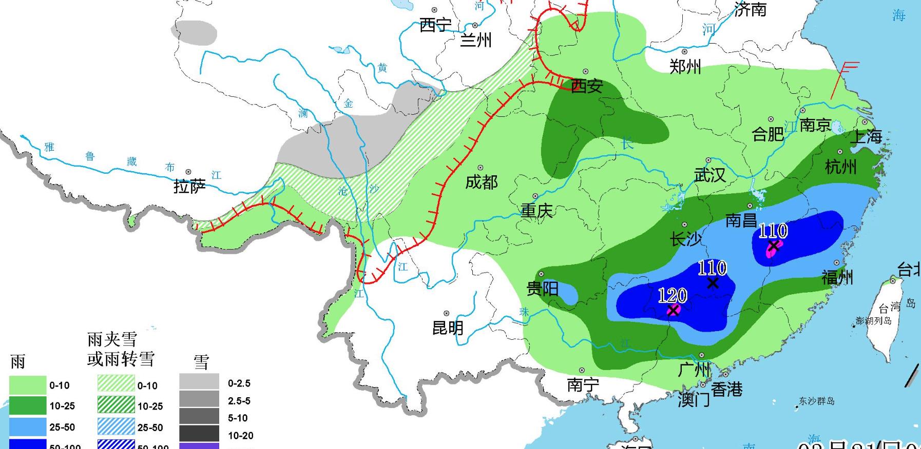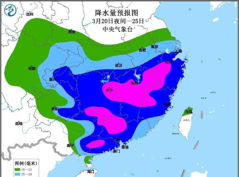 在这样一个复杂而有利于降水发展的环境下,最终冷暖气团将在南方长江以南对撞,从而形成一条强盛的降水带——从中央气象台的预报上看,由于冷空气比较强,并且水汽输送持续不断,冷暖气团交战形成的暴雨将逐渐南下,3月23日将开始影响到广西、广东、福建三省,多地还将出现大到暴雨甚至局部大暴雨。