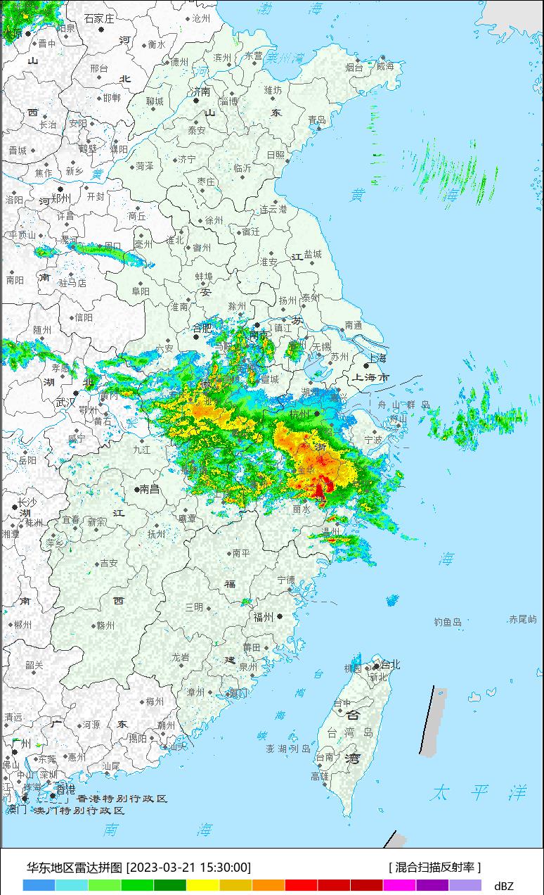 而实际上,我国南方地区的降雨正处在增强的迹象——3月21日下午,从雷达图上可见,长三角地区的阴云中,对流活动发展得相当旺盛,出现了大规模的黄色-橙色回波,甚至浙江境内出现了大片深红色雷达回波,显示出局部地区已经出现了相当激烈的降水活动,还可能伴随着雷暴大风冰雹等激烈天气。
