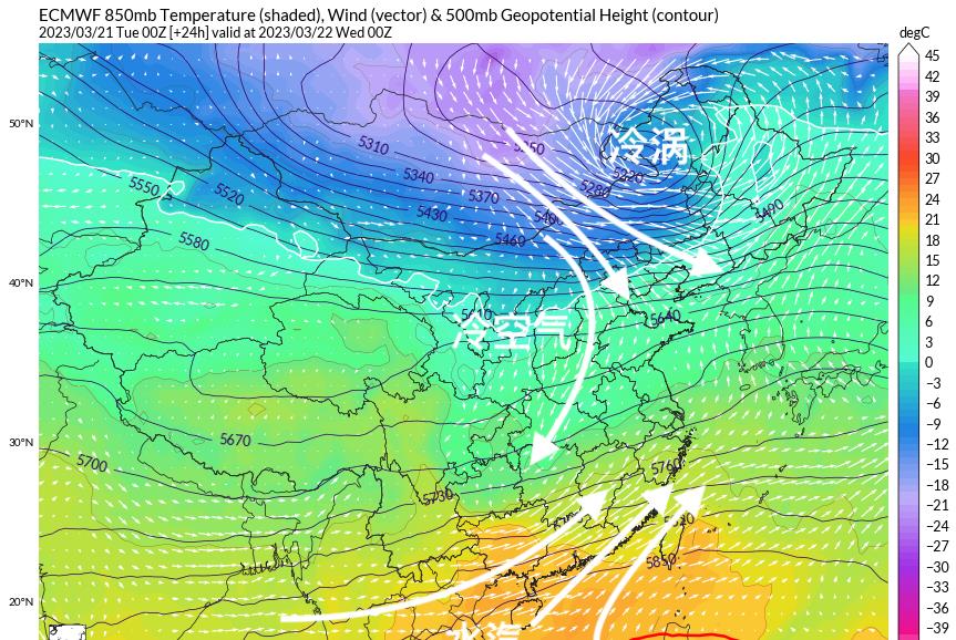 从中央气象台的预报上看,3月21日,主雨带位于长江中下游沿江至江南北部一带;而3月22日起雨带南压,同时大范围强对流天气开始发展,主要出现在江南南部至华南一带;23日至25日华南地区强对流天气最为显著。超级计算机的预报中则指出,3月22日凌晨,江南一线的强对流天气将猛烈爆发,在贵州东部到浙江杭州湾一线形成一道极为旺盛的强对流带,在这条强对流带上,雷暴大风冰雹等激烈天气可能密集出现。