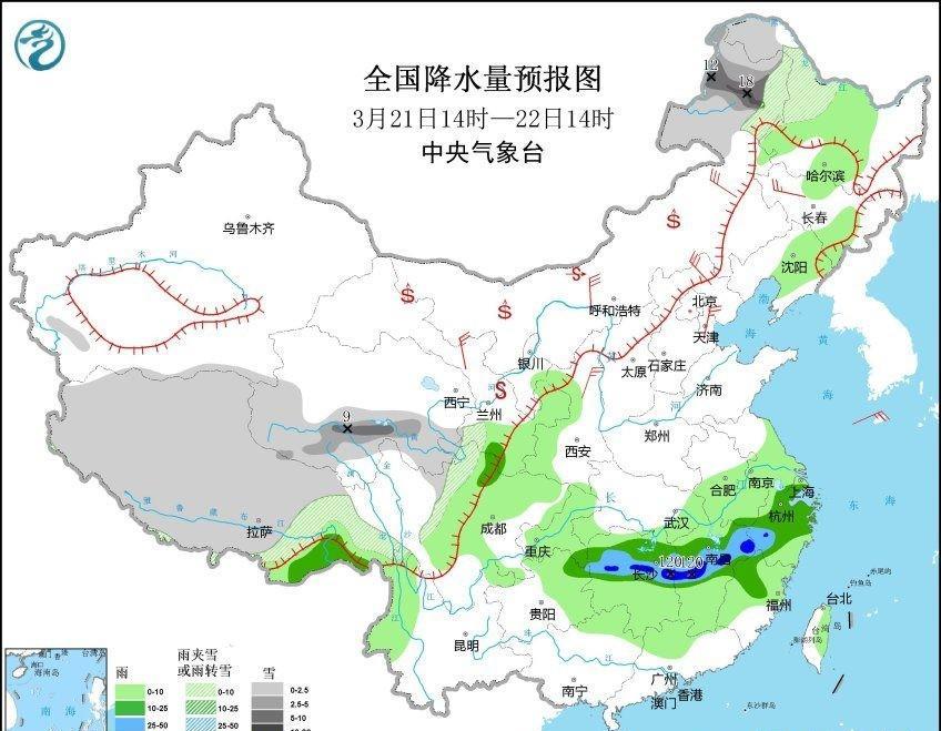 像是中央气象台的监测数据显示,对应卫星云图上大范围的降水云系,3月20日-3月21日,我国长江中下游地区出现了大范围的降雨,尤其是长三角地区成为昨天到的降水中心,出现了大片中到大雨。