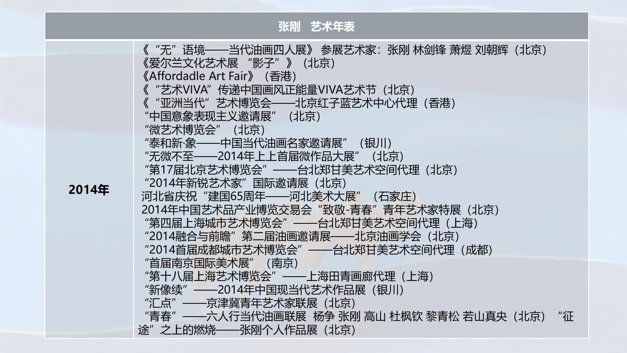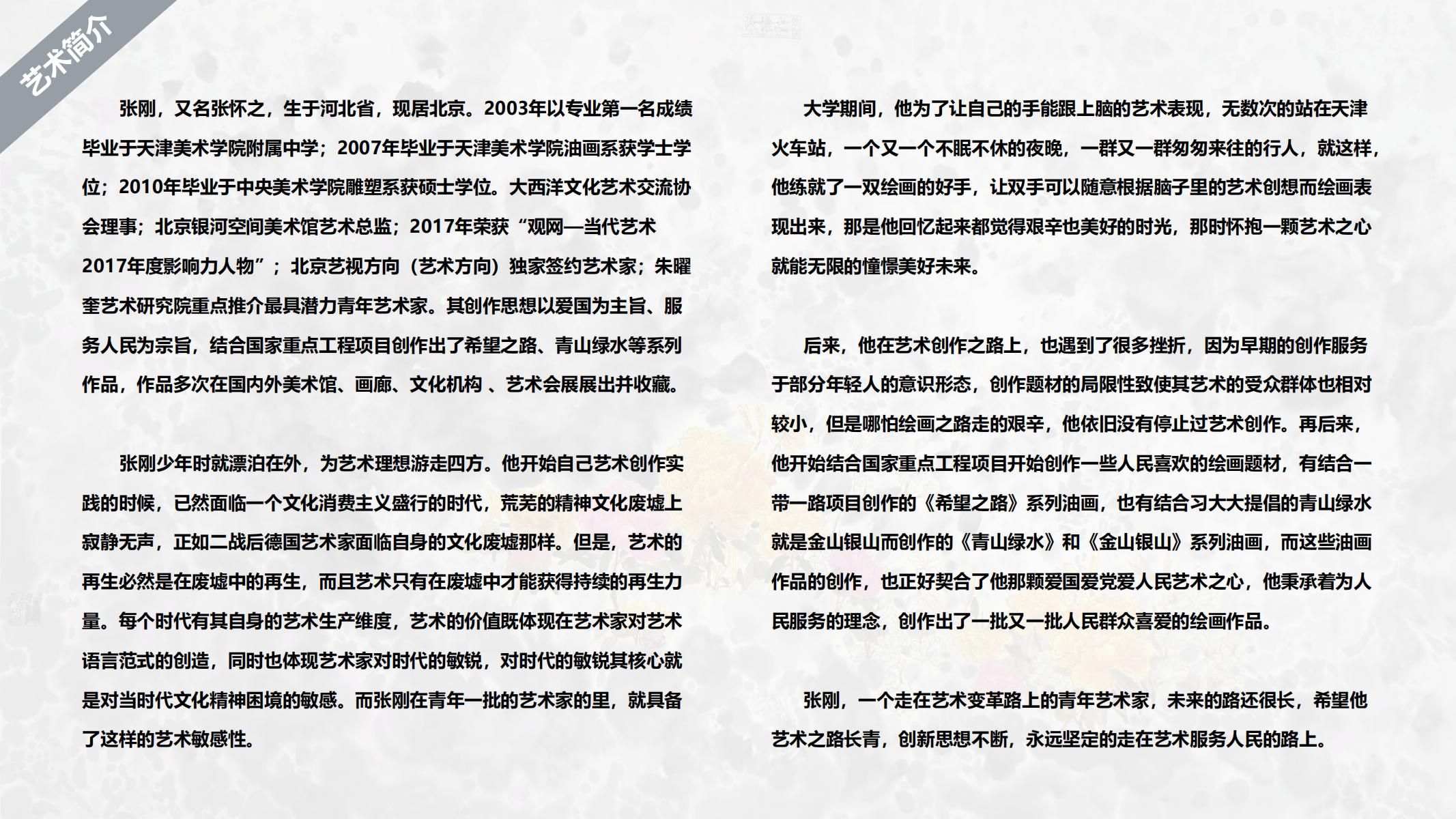 张刚,祖籍河北,现居北京。2007年毕业于天津美术学院油画系获学士学位;2010年毕业于中央美术学院雕塑系获硕士学位。大西洋文化艺术交流协会理事;北京银河空间美术馆艺术总监;2017年荣获“观网—当代艺术2017年度影响力人物”;北京艺视方向(艺术方向)独家签约艺术家;朱曜奎艺术研究院重点推介最具潜力青年艺术家。其创作思想以爱国为主旨、服务人民为宗旨,结合国家重点工程项目创作出了一带一路、青山绿水等系列作品,作品多次在国内外美术馆、画廊、文化机构 、艺术会展展出并收藏。