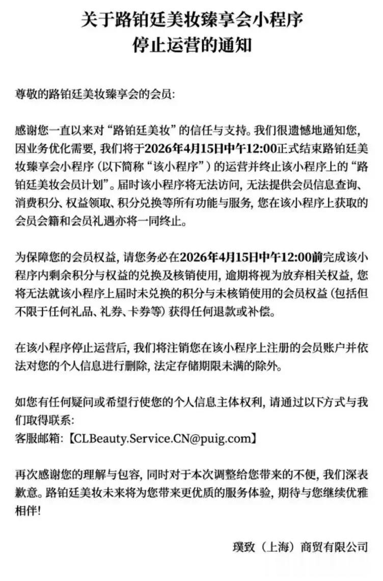 根据官方通知,路铂廷美妆“美妆臻享会”会员小程序将于2026年4月15日中午12:00正式停止运营,同时终止所有会员会籍及礼遇。有媒体发现,其某平台官方旗舰店商品已全部清空,目前仅天猫、京东旗舰店仍在维持运营。业内普遍解读:这个定价千元级别的奢侈美妆品牌,正在上演“战略性撤退”,甚至可能彻底退出中国市场。