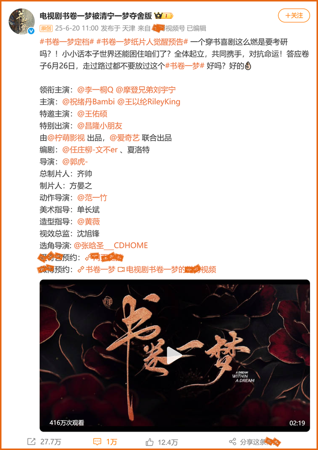 片方于6月20日发布的定档文案转评赞数量均已过万,有未播先火的迹象。这也能为祝绪丹提供不少底气。