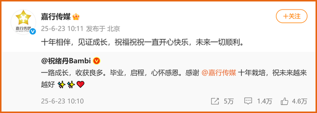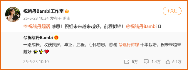 “天下无不散之筵席”,6月23日,祝绪丹在社交平台上敲下一句“毕业,启程,心怀感恩”,算是正式给和嘉行传媒的十年画上了句号。