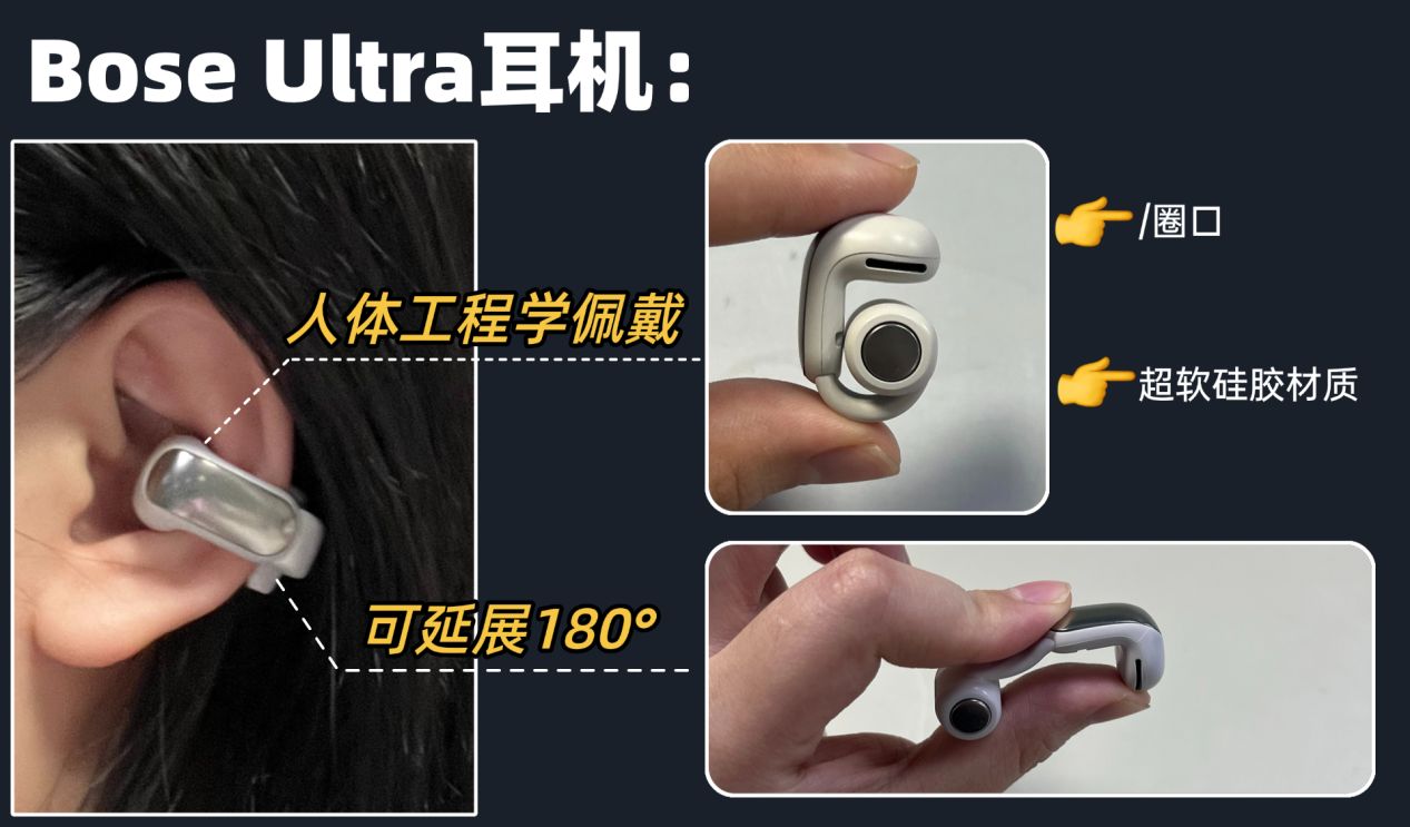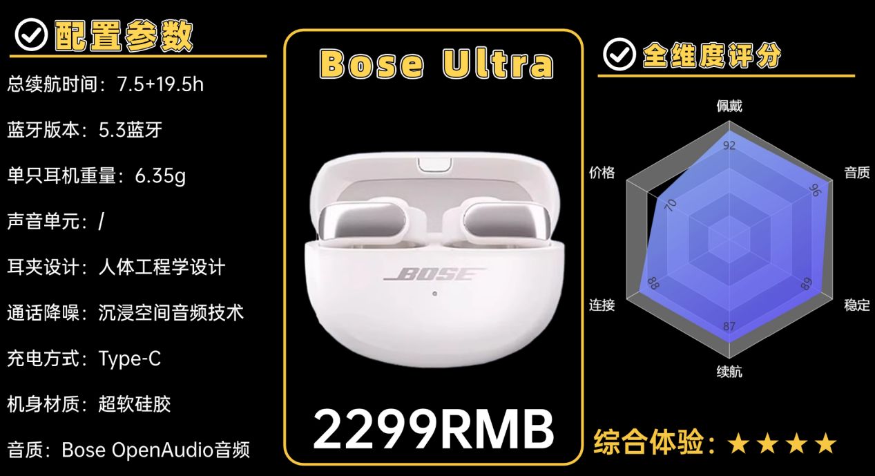 第二款:【Bose Ultra耳机】售价:2299¥防漏音技术:无综合推荐指数:★★★★Bose是国际知名的音频品牌,在声学技术上积累很深,尤其在声音调校和佩戴工学上有自己的优势,用户基础扎实。这款Bose Ultra作为品牌旗下的耳夹式机型,延续了品牌对“佩戴与音质平衡”的追求,面向喜欢高品质体验的用户,品质和品控都比较有保障。