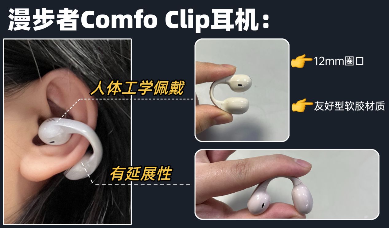 第三款:【漫步者Comfo Clip耳机】售价:319¥防漏音技术:无综合推荐指数:★★★漫步者是国内老牌音频品牌,做耳机很多年了,性价比一直不错,在数码配件和音频设备领域积累深厚,品控严格。这款Comfo Clip是品牌面向入门市场的耳夹式机型,主打“基础实用”,让用户花少钱能买到能用的耳夹式耳机,适合预算有限的人。
