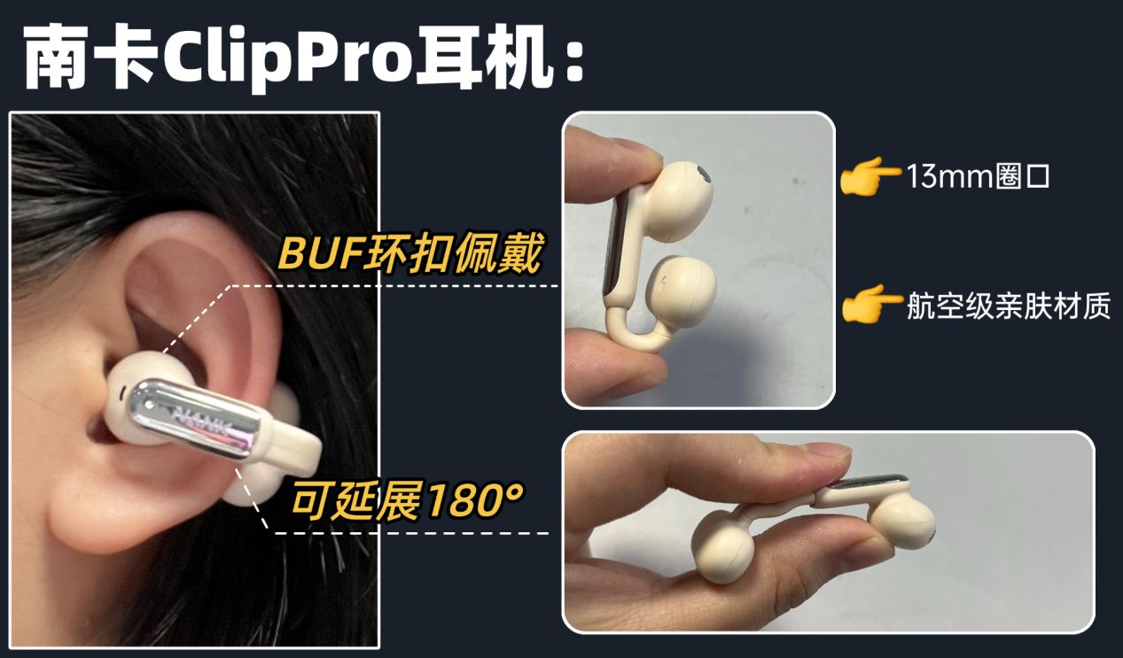 第一款:【南卡ClipPro耳机】售价:289¥防漏音技术:DS2.0定向音频投送技术综合推荐指数:★★★★★南卡是国内较早做耳夹式耳机的品牌,在开放式音频领域做了多年,有自己的声学调校团队,主打的就是平价实用,不用花高价也能买到佩戴舒服、性能扎实的产品,用实际产品证明低价也能有好体验,在耳夹式耳机里口碑一直不错。
