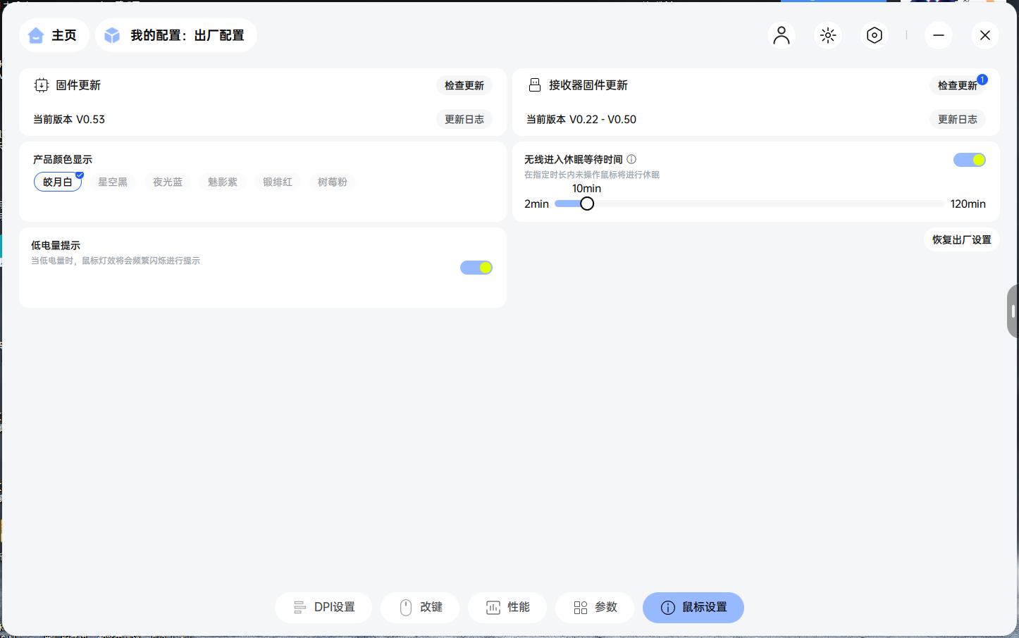 雷柏VT7系列鼠标驱动堪称 “外设管理中枢”,界面简约却,功能全面。首页直观显示设备电量与连接状态,点击设备即可进入详细设置。