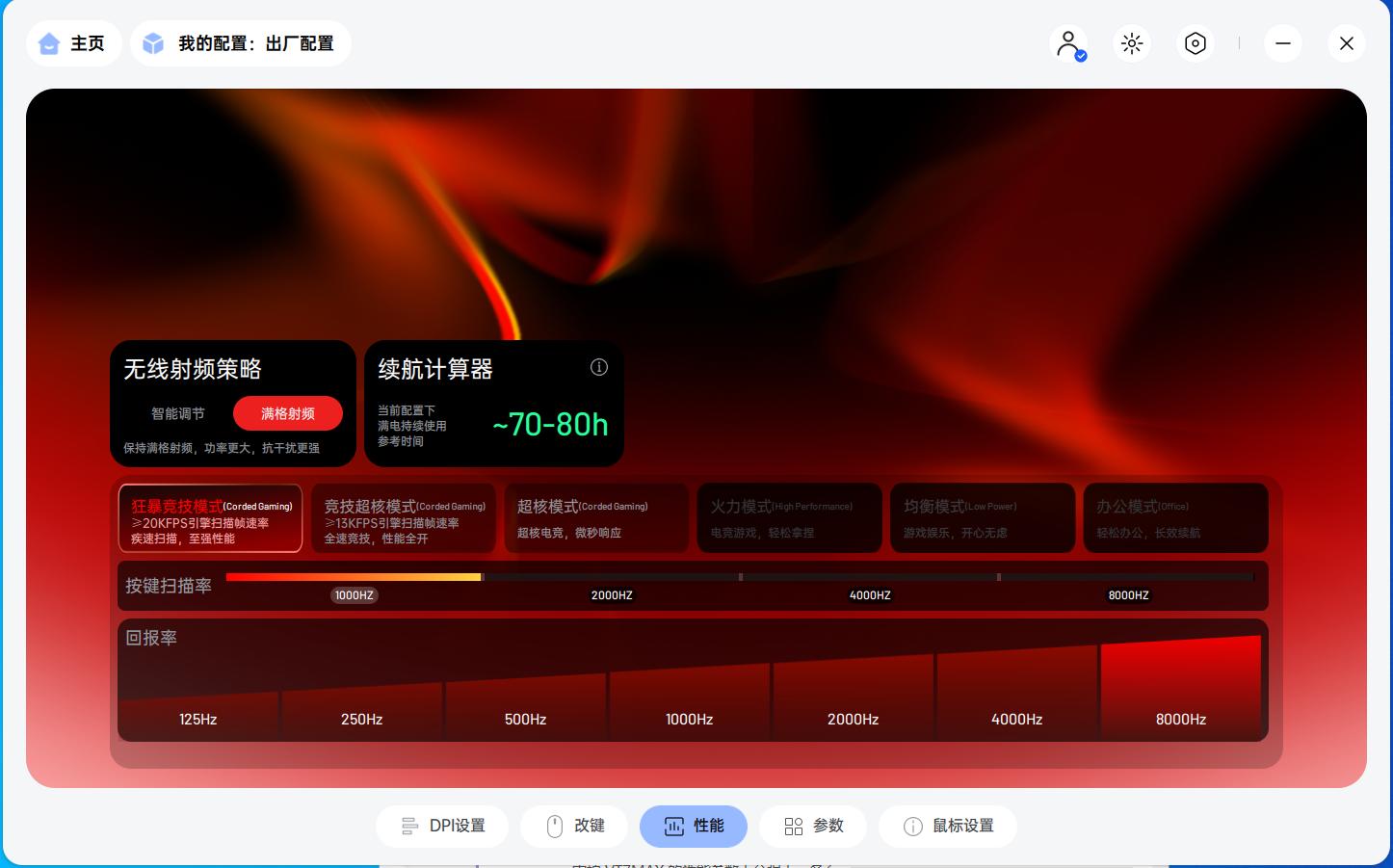 性能设置,预设办公、均衡、火力、超核、竞技超核、狂暴竞技等 6 种模式,狂暴模式下传感器扫描频率突破 20000FPS,专为 FPS 电竞优化。最实用的是配置文件同步功能:板载存储可保存 8 组设置,登录账号还能跨设备同步,切换电脑无需重新调校。驱动还会实时计算不同模式下的预计续航,帮助用户平衡性能与电量。