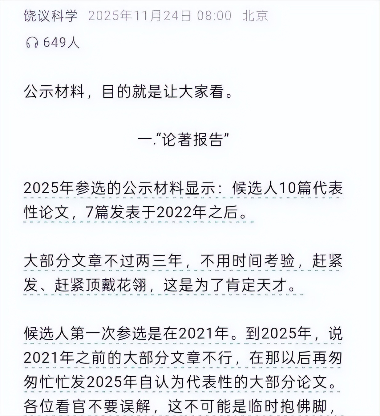 现在大家最关心的是,这事到底能不能查清楚?院士评选不是 “一评了之”,得有透明的监督机制,更得有能上能下的退出制度。要是真像饶毅质疑的那样,靠突击论文、行政资源就能拿到院士头衔,那不仅寒了一线科研人员的心,更会拖慢整个国家科技发展的脚步。