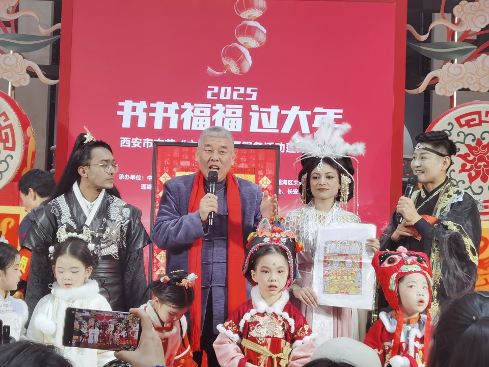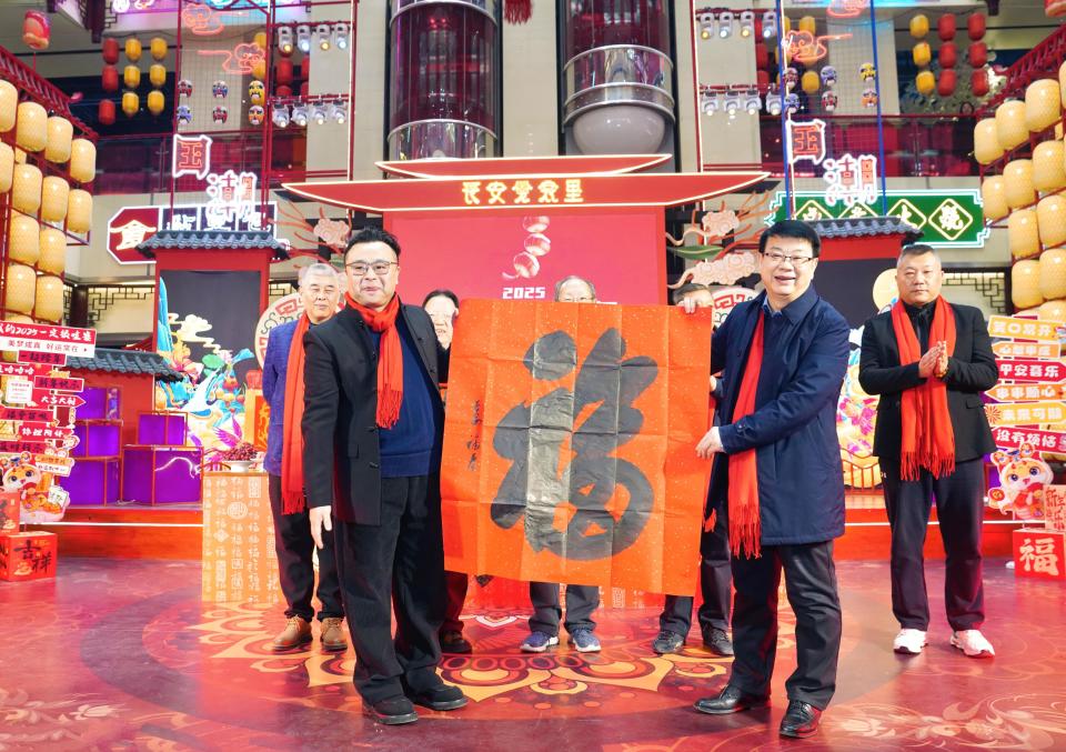 陕西省传统文化发展促进会秘书长郑欣代表促进会,向长安霓裳里赠送了由陕西省书协副主席吴福春书写的一米大“福”字。当这幅笔力刚劲、墨香四溢的“福”字亮相,现场掌声和欢呼声一片,在喜庆热闹的氛围中,为新的一年送上了美好的祝福。