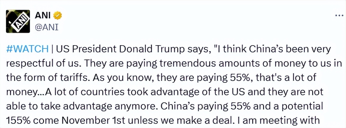 他是这样说的——除非中美达成协议,否则从11月1日开始,中国可能要向美国支付155%的关税。