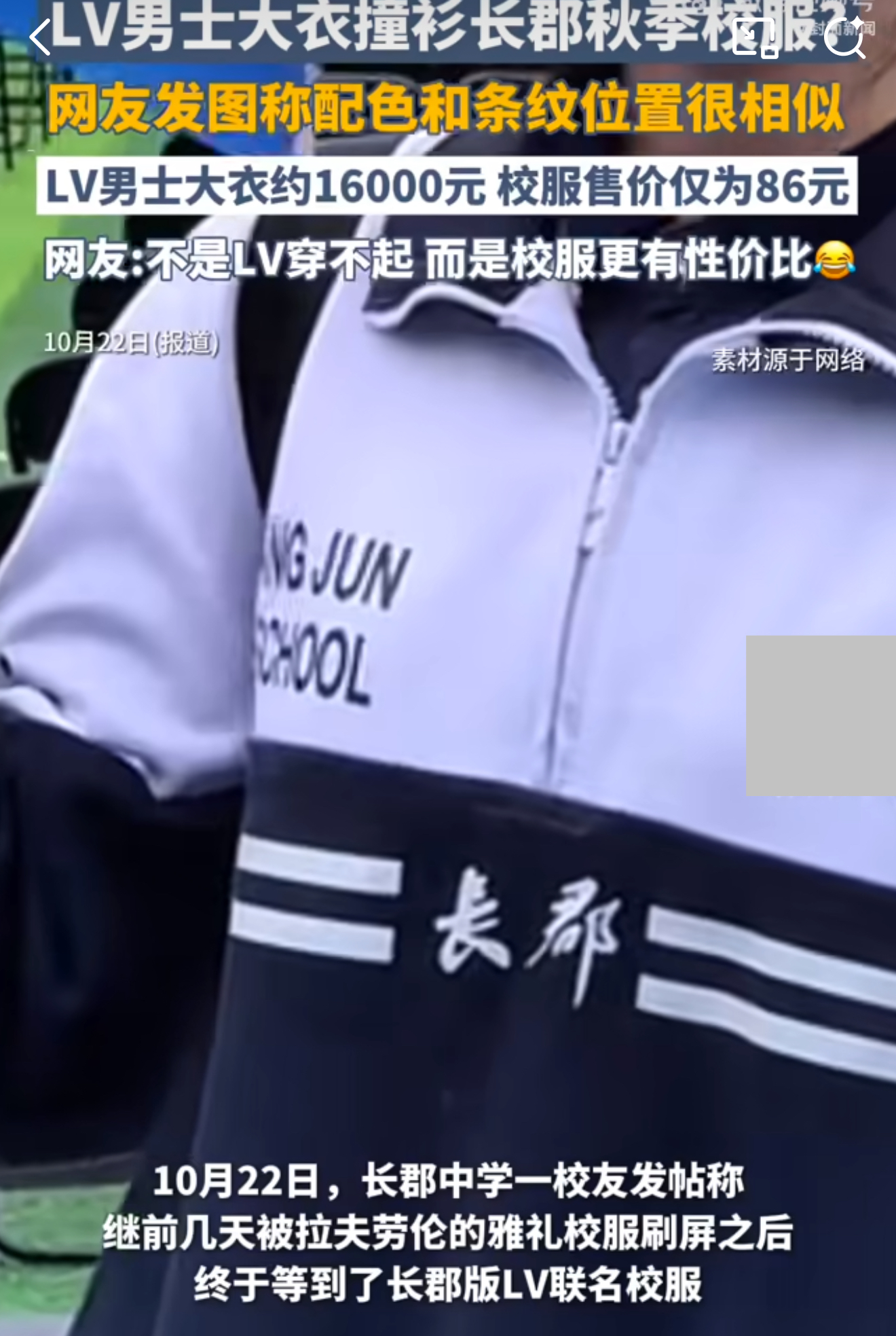 这几天,一则看似“轻松”的时尚趣闻在社交平台炸开了锅。有网友发现,某国际奢侈品牌LV推出的一款男士大衣,标价高达16000元,竟与长沙某中学的校服“撞了个满怀”。从网友晒出的对比图看,两款衣服的黑白配色比例如出一辙,连袖口束口设计都如复制粘贴般相似。但价格却天差地别——LV大衣够买185件校服,校服只要86元,这差距让人直呼“魔幻”。