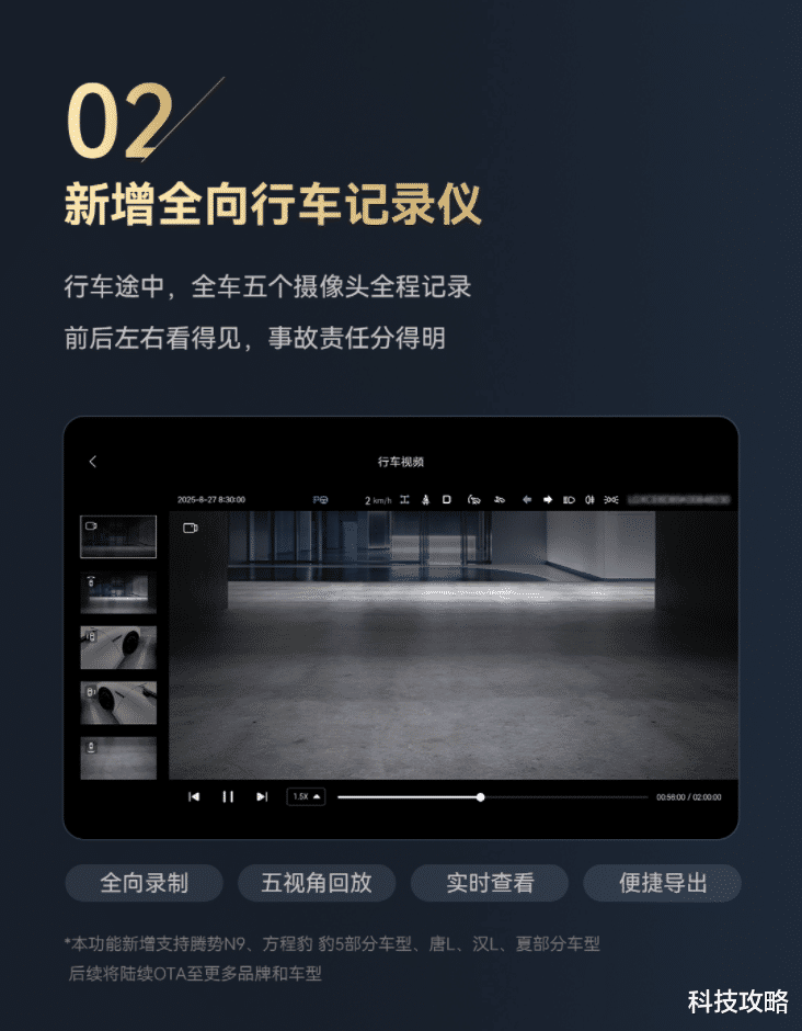 本次OTA升级不仅有车道级导航、还拥有全向行车记录仪功能,它可以提供五个视角进行预览录制回放等,感觉这个功能对于责任划分很重要。
