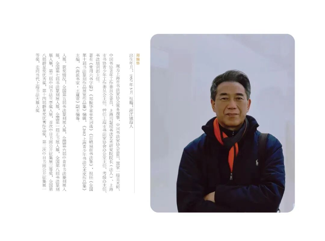 郑振华,1957年5月生于上海,浙江镇海人,上海市书法家协会常务理事、中国书法家协会会员,国家一级美术师、中国书协老年工作委员会委员、上海周慧珺书法艺术研究院院长(法人)。上海市青少年工作委员会主任。曾任上海市书法家协会办公室主任、考级办主任、书法培训部主任。
