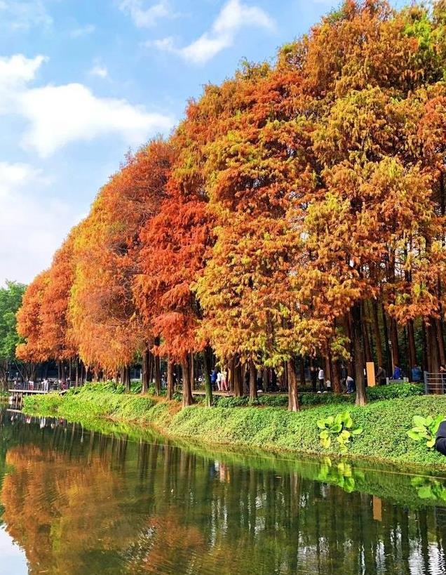 麓湖公园的落羽杉,主要分布在公园和湖堤岸边。走进公园,沿着木栈桥漫步,你会发现眼前是一片被染红的树林,仿佛置身于童话世界。